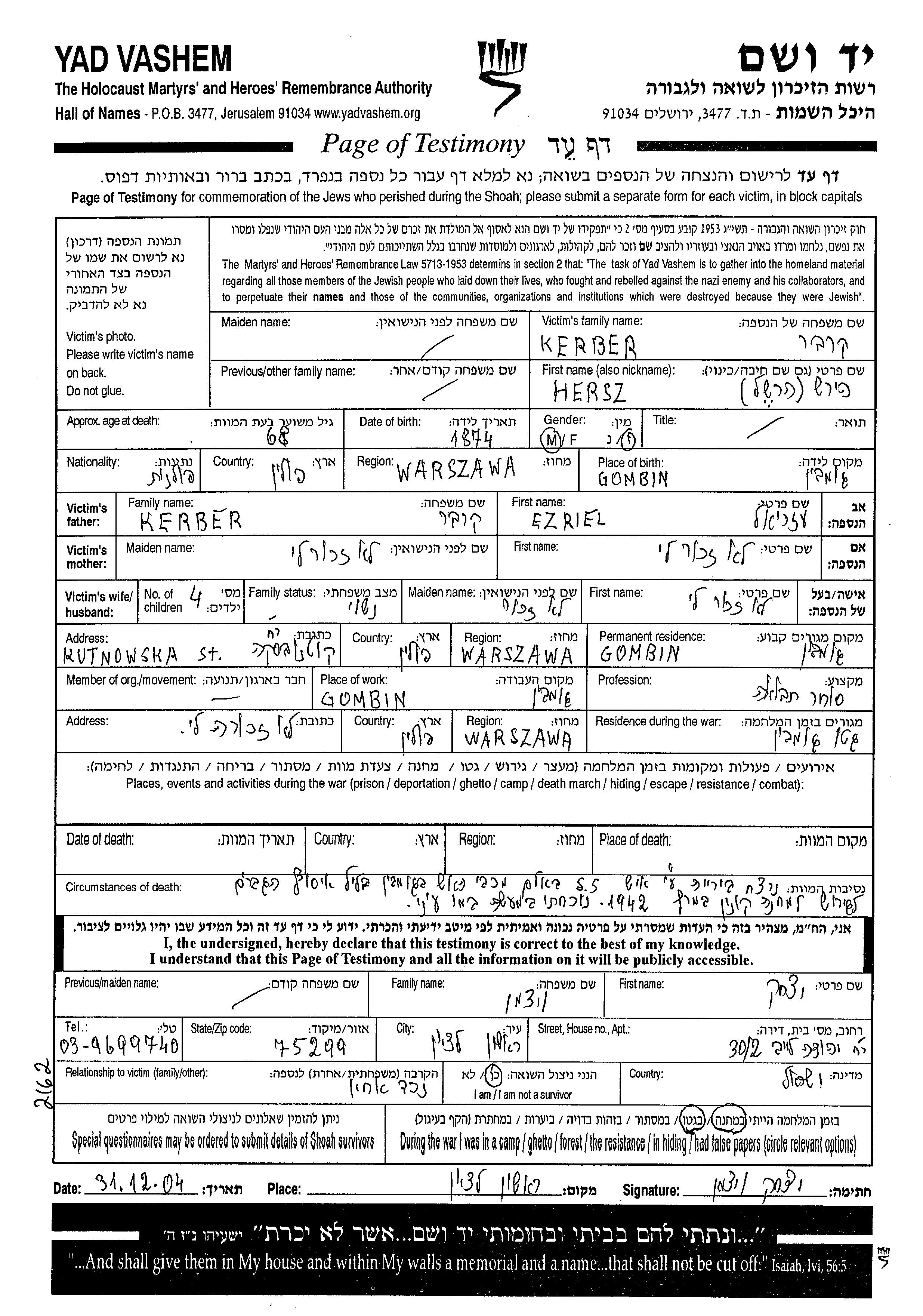Hershel Kerber est né à Gombin, Pologne en 1874, fils de Ezriel. Il était Marié. Avant la seconde guerre mondiale il vivait à Gombin, Pologne. Au cours de la guerre, il était à Gabin, Pologne.