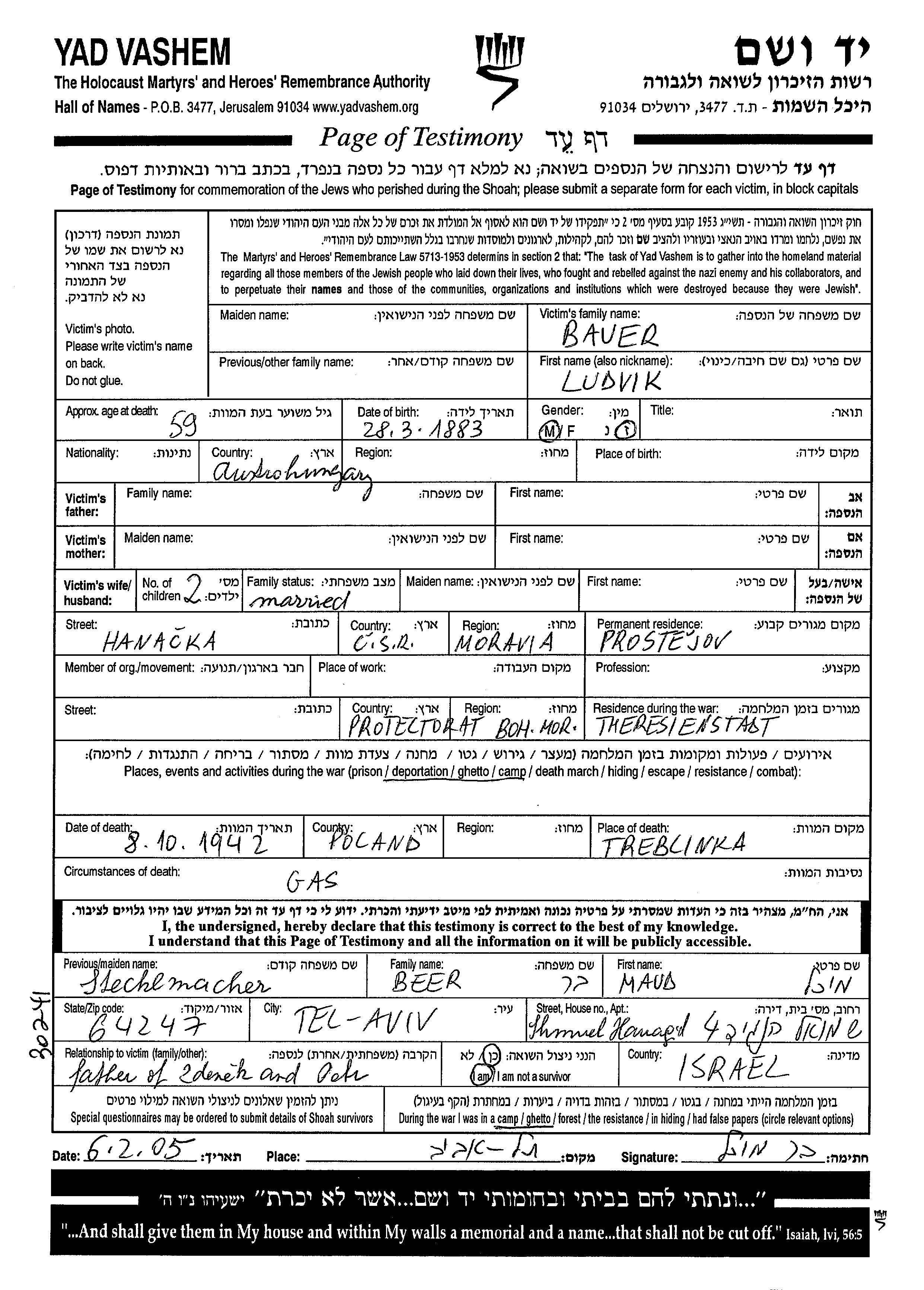 Bauer Ludvik 1883 Prostejov, Tchécoslovaquie Feuille de témoignage