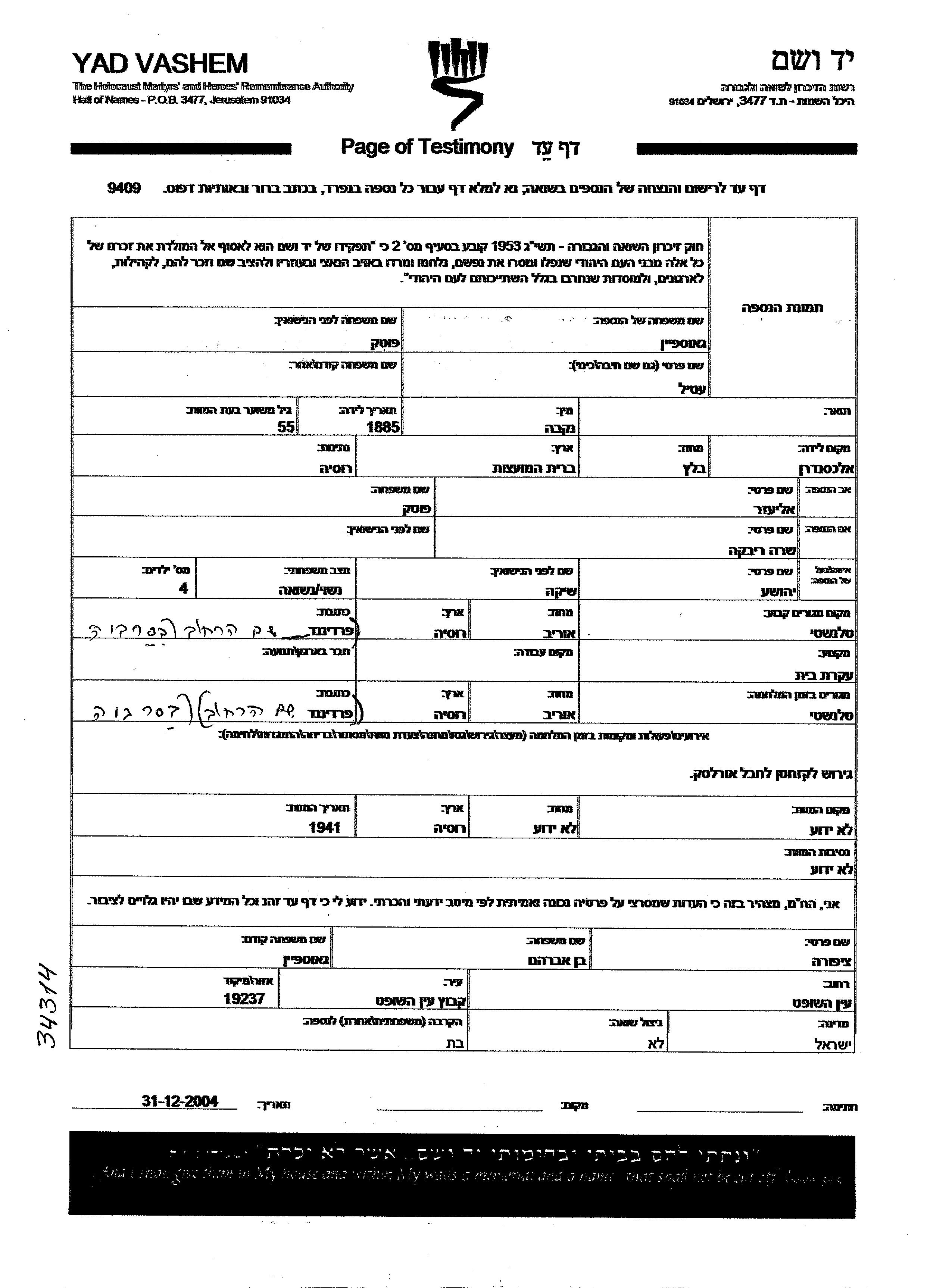 Yad Vashem - Pages of Testimony Names Memorial Collection