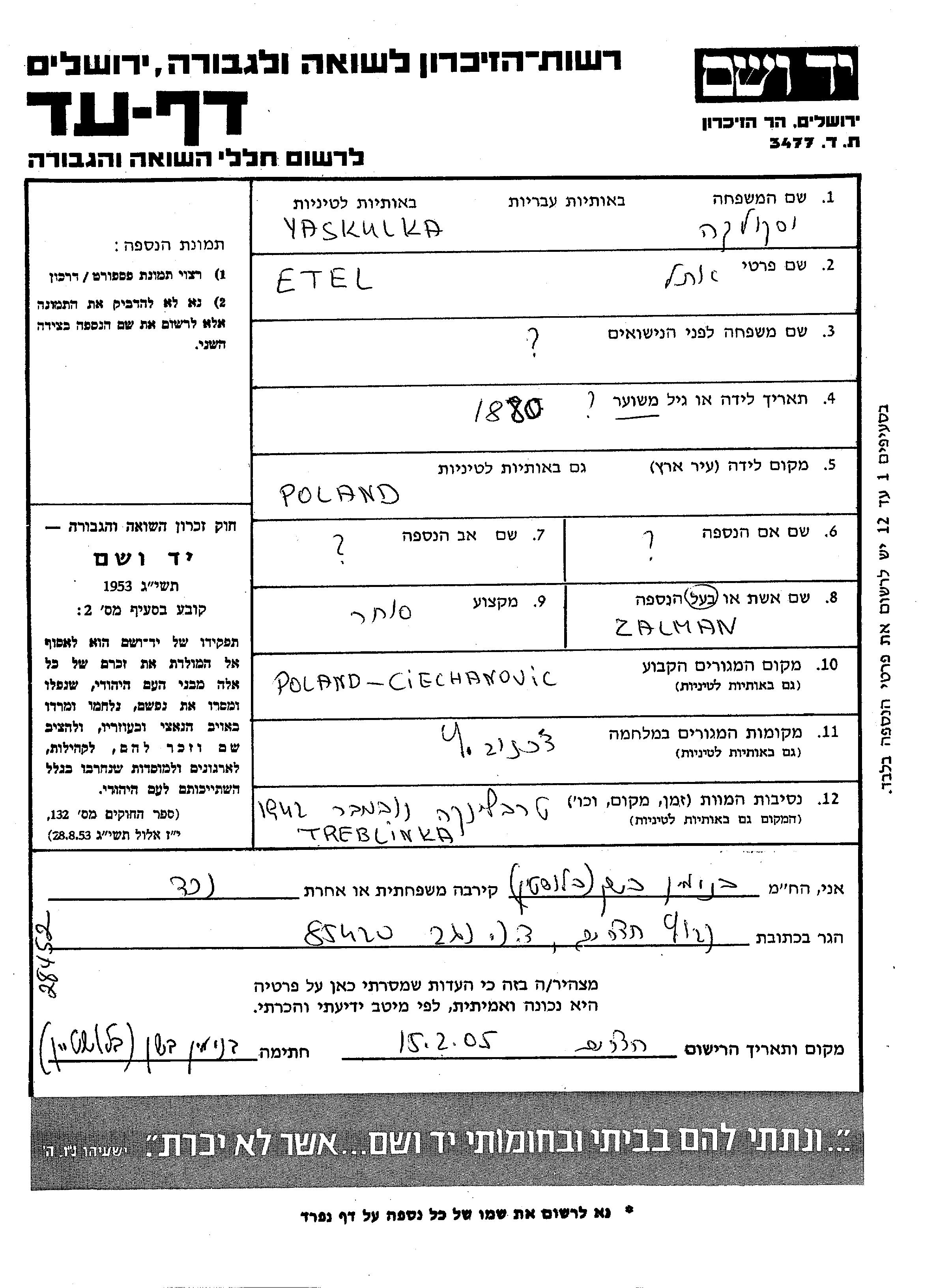 Etel a été assassinée pendant la Shoah. Lieu de la mort: Treblinka, Pologne en 11/1942.