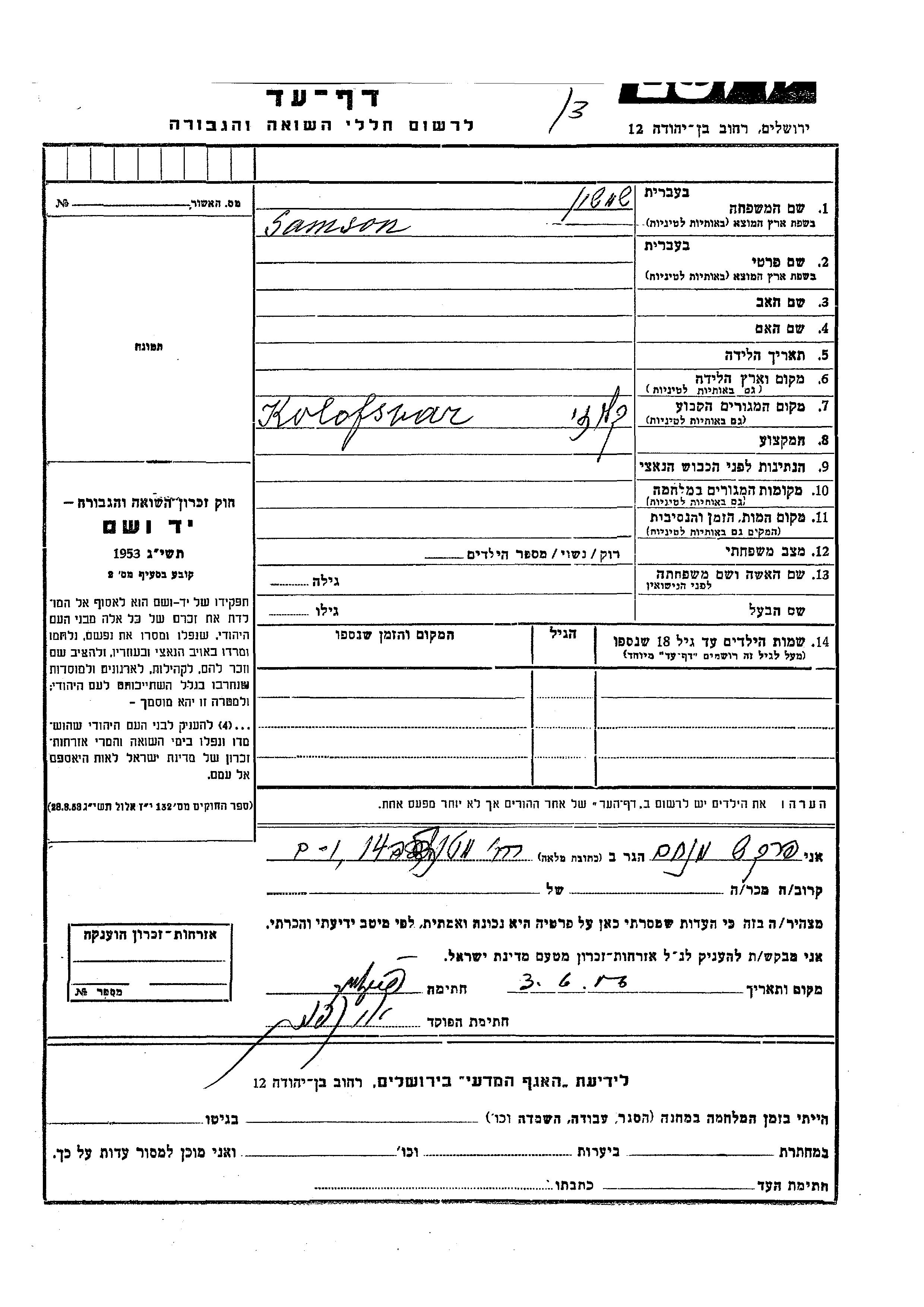Samson prénom inconnu Kolofsvar, Roumanie Feuille de témoignage
