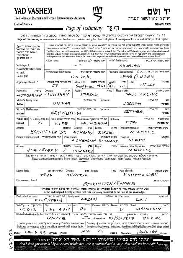 Yad Vashem - Pages of Testimony Names Memorial Collection
