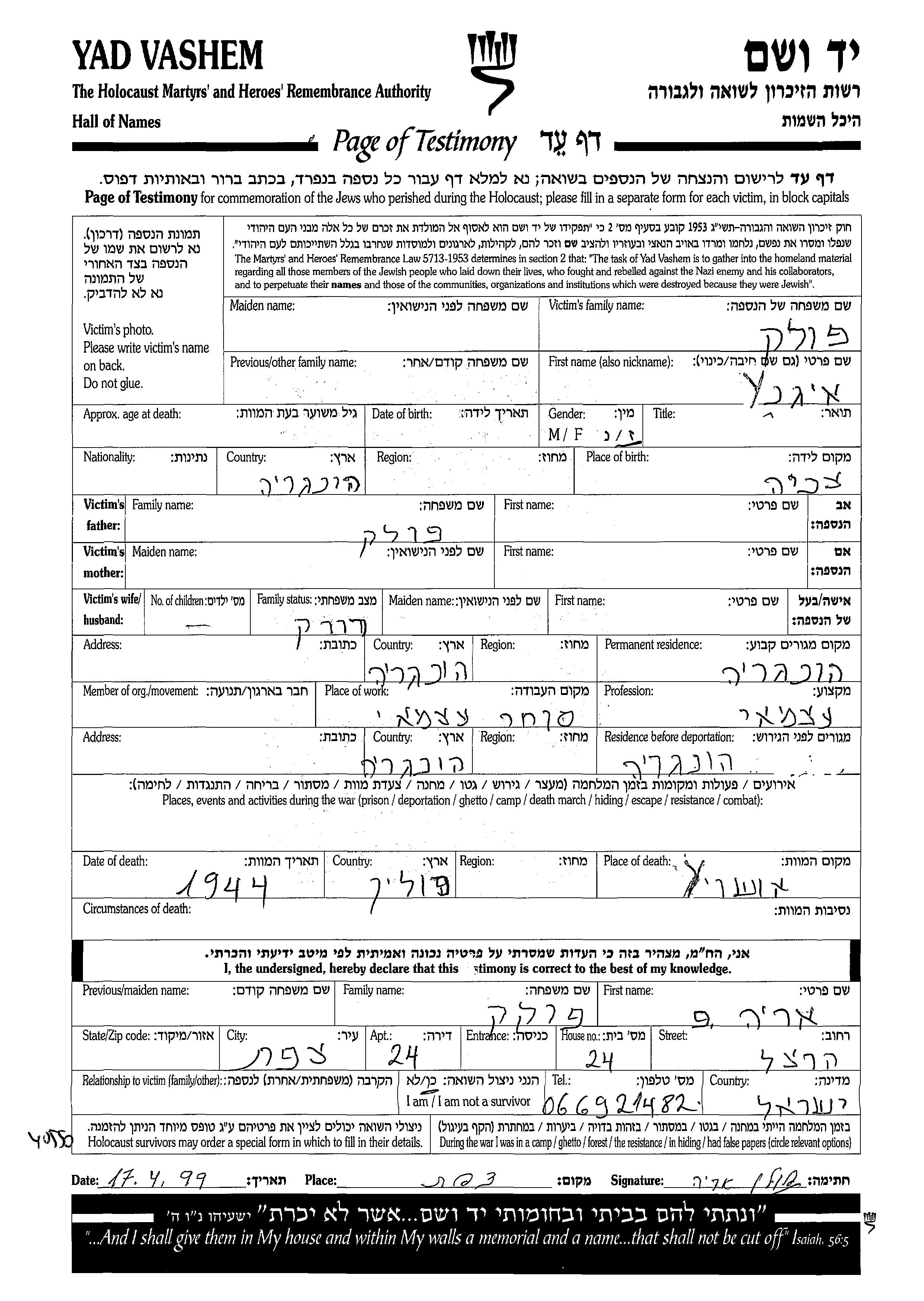 Yad Vashem - Pages of Testimony Names Memorial Collection