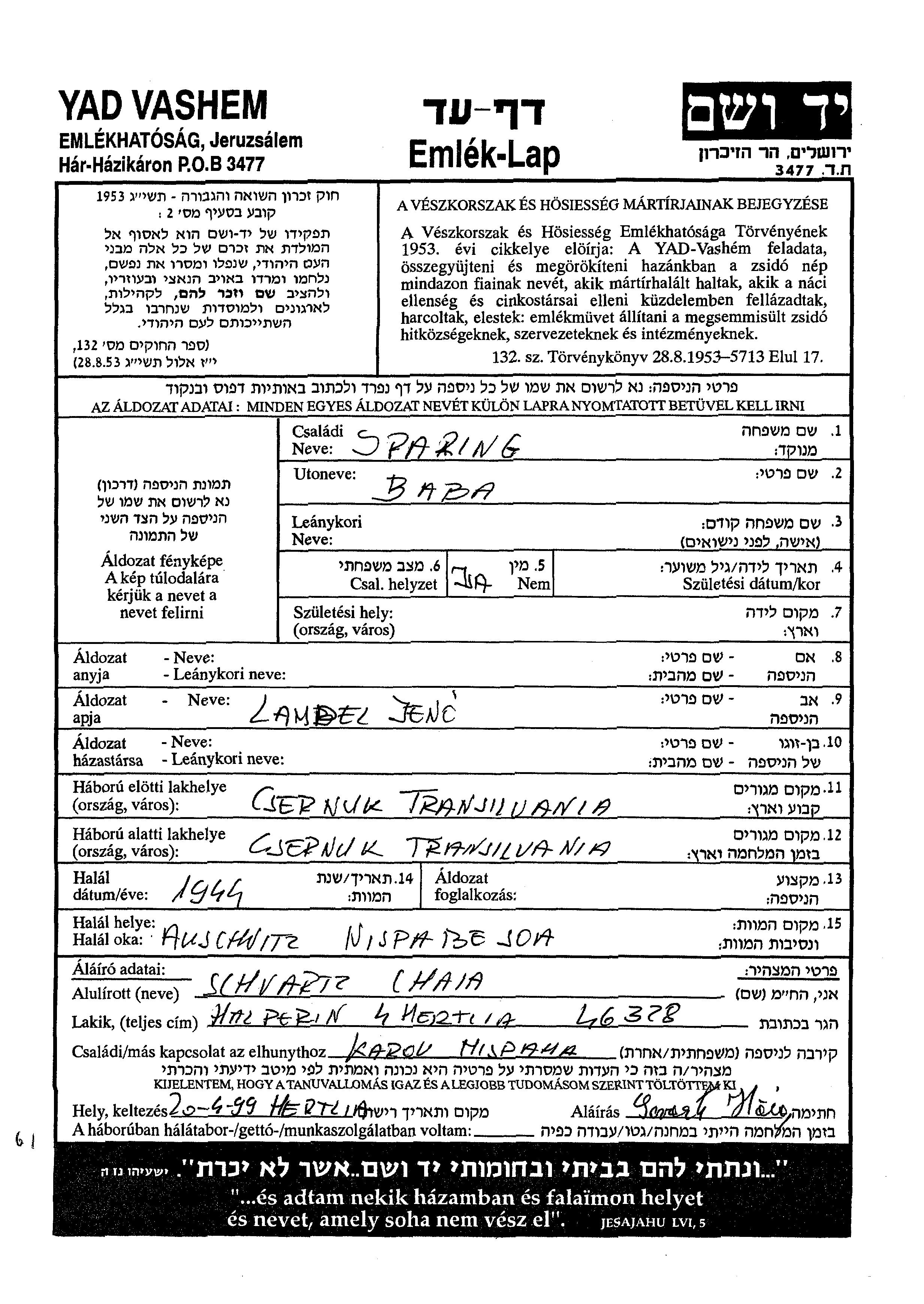 Baba Sparing est née fille de Jeno. Avant la seconde guerre mondiale elle vivait à Cernuc, Roumanie. Pendant la guerre, elle était à Cernuc, Roumanie.