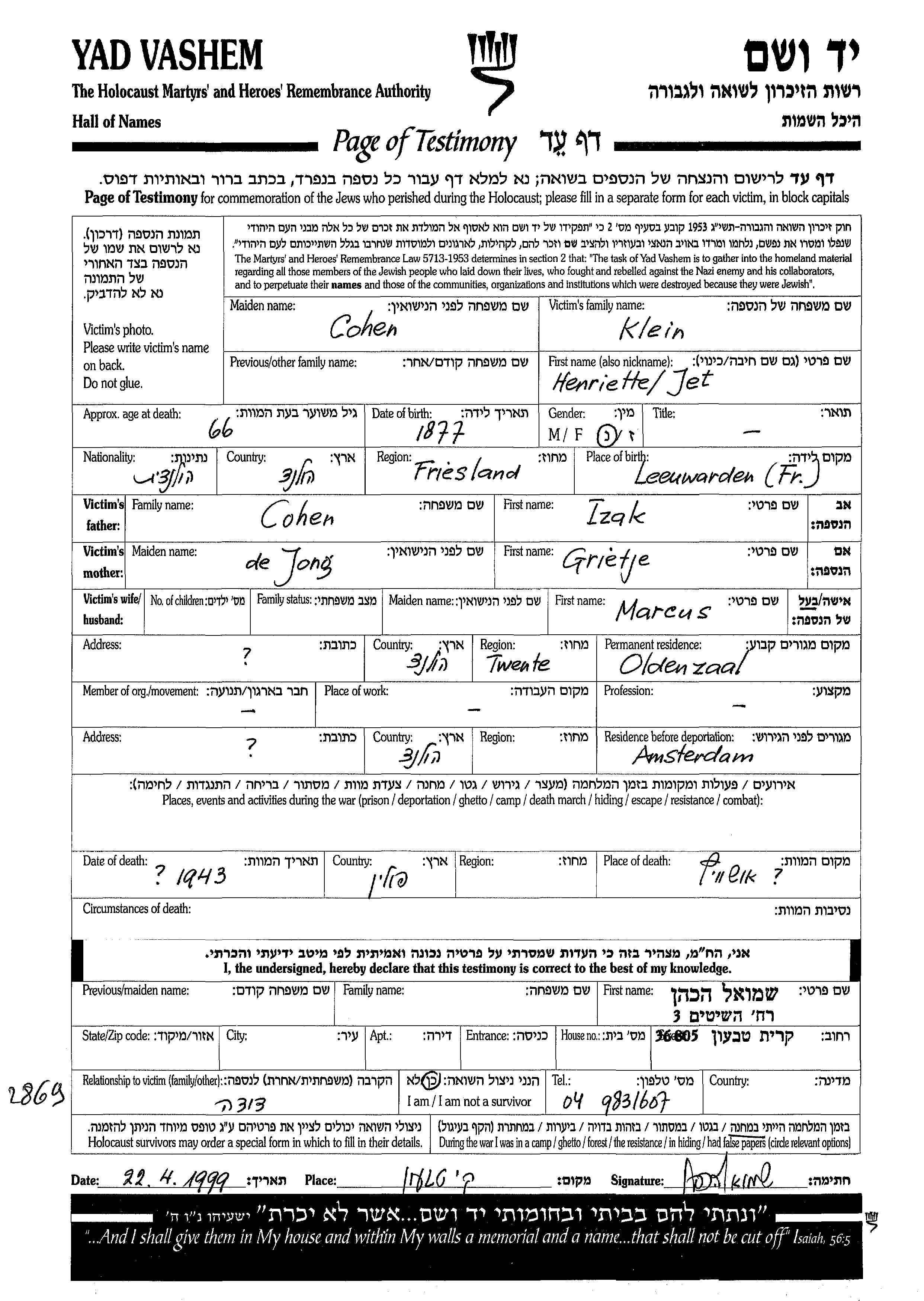 Jet Klein née Cohen est née à Leeuwarden, Pays-Bas en 1877, fille de Izak et de Grietje née Jong de. Elle était Mariée à Marcus. Avant la seconde guerre mondiale elle vivait à Oldenzaal, Pays-Bas. Pendant la guerre, elle était à Amsterdam, Pays-Bas.