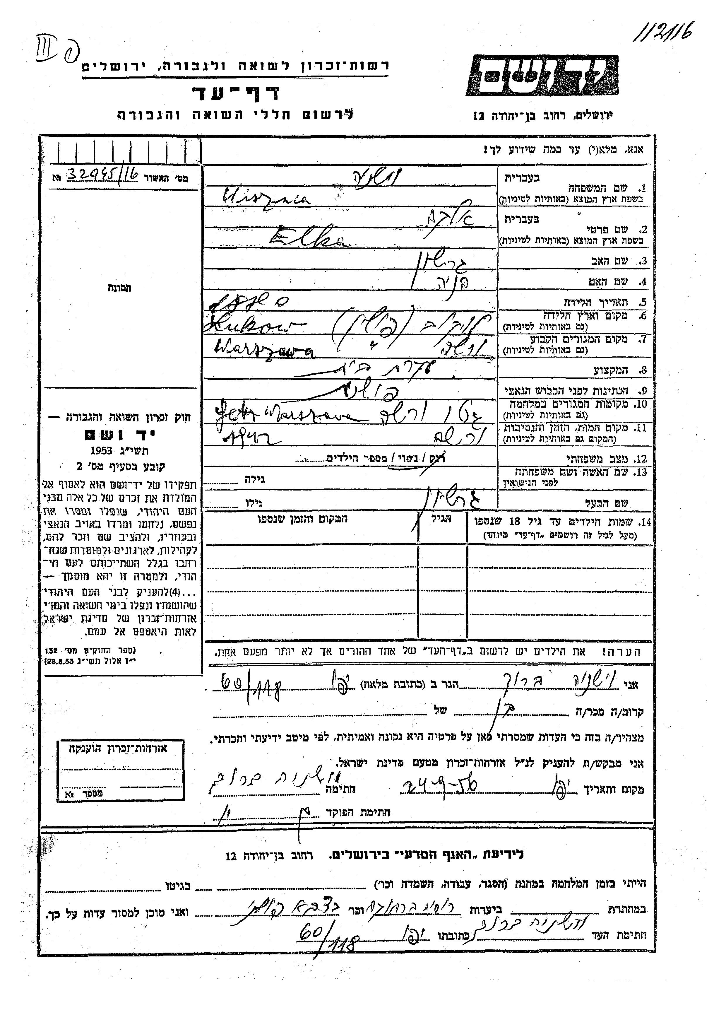 Wisznia Elka Warszawa, Pologne Feuille de témoignage