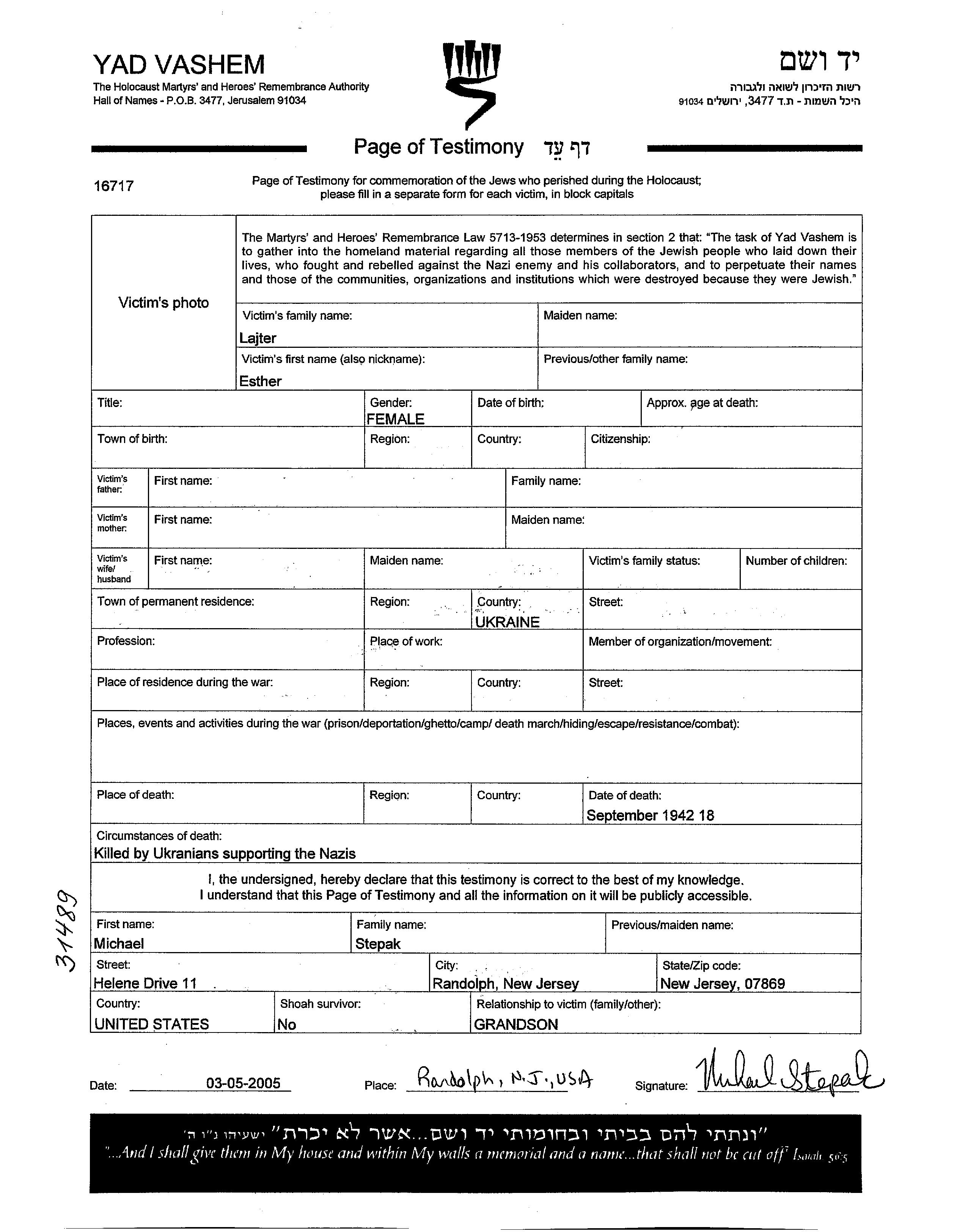 Yad Vashem - Pages of Testimony Names Memorial Collection