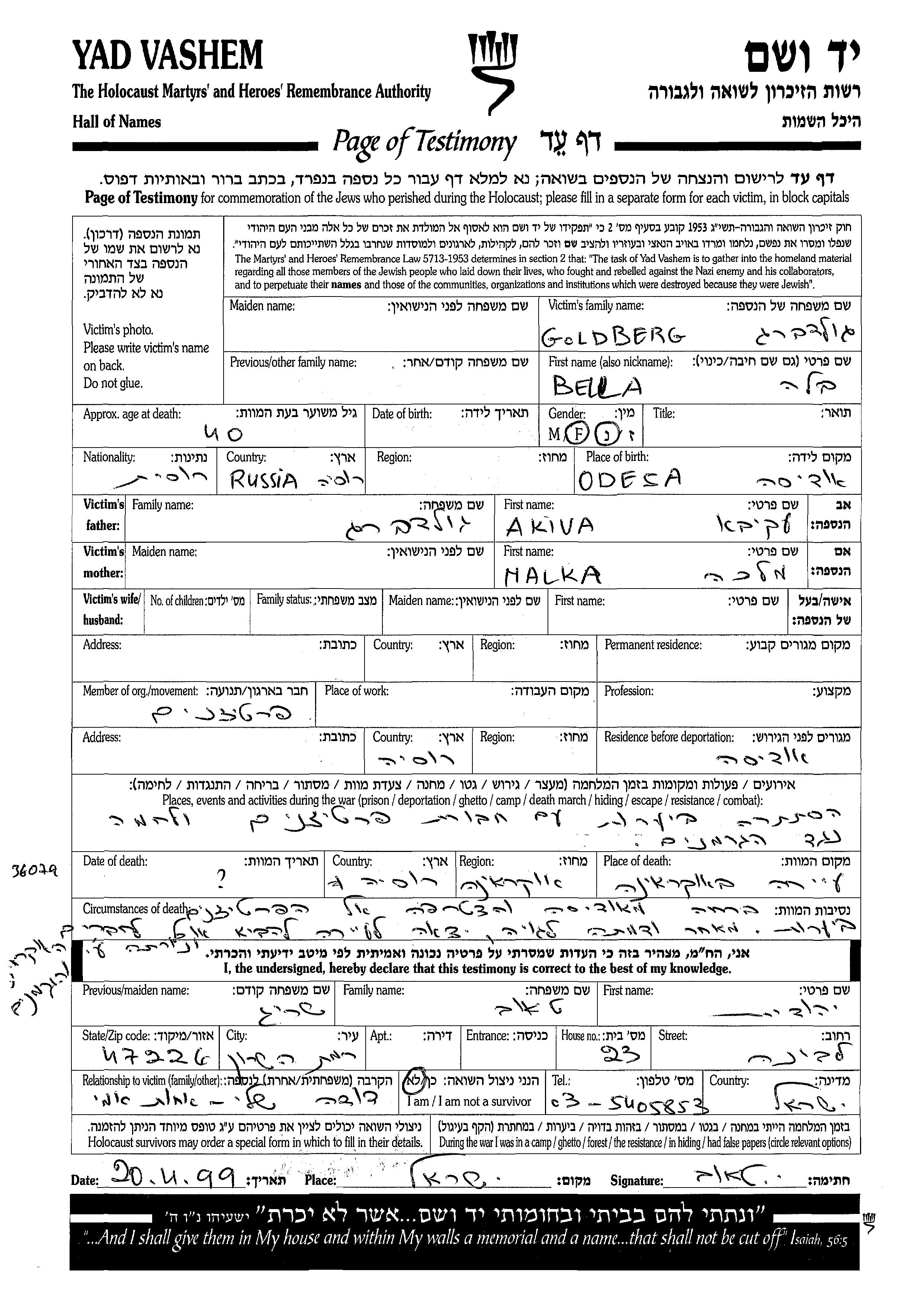 Yad Vashem - Pages of Testimony Names Memorial Collection