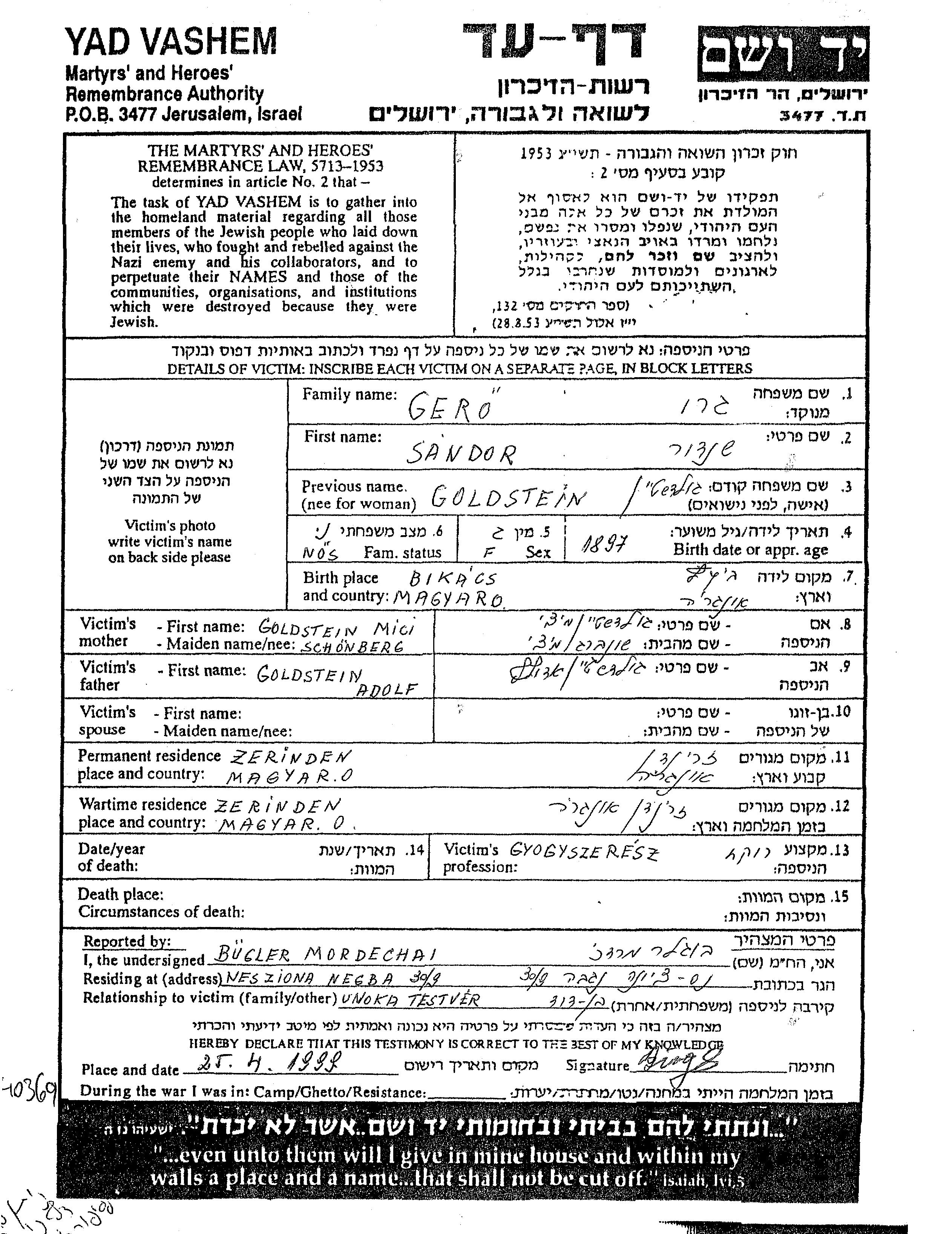 Sandor Gero est né à Bikacs, Hongrie en 1897, fils de Adolf et de Mici née Schonberg. Il était Pharmacien/ne et Marié. Avant la seconde guerre mondiale il vivait à Zerind, Roumanie. Au cours de la guerre, il était à Zerind, Roumanie.