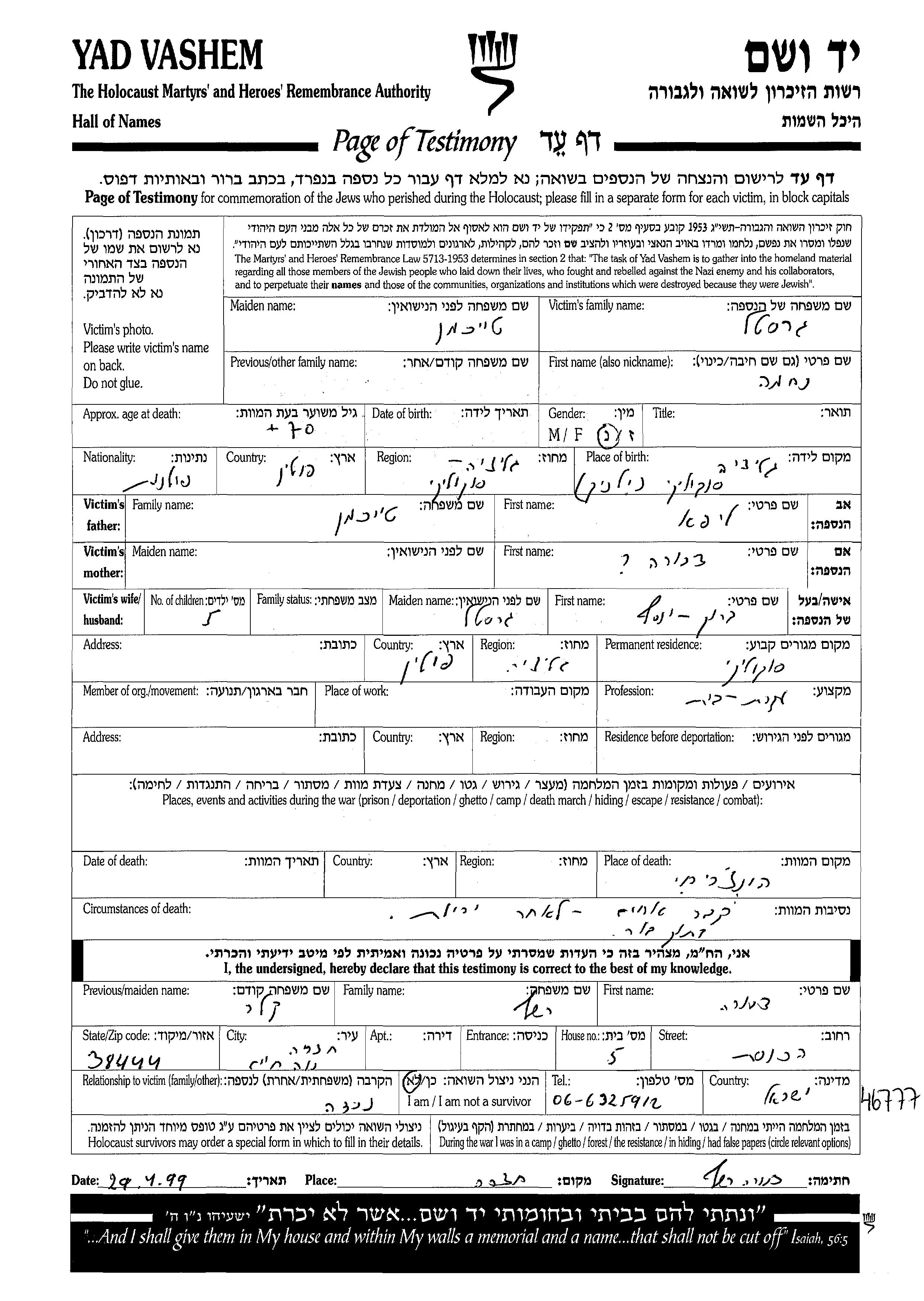 Yad Vashem - Pages of Testimony Names Memorial Collection