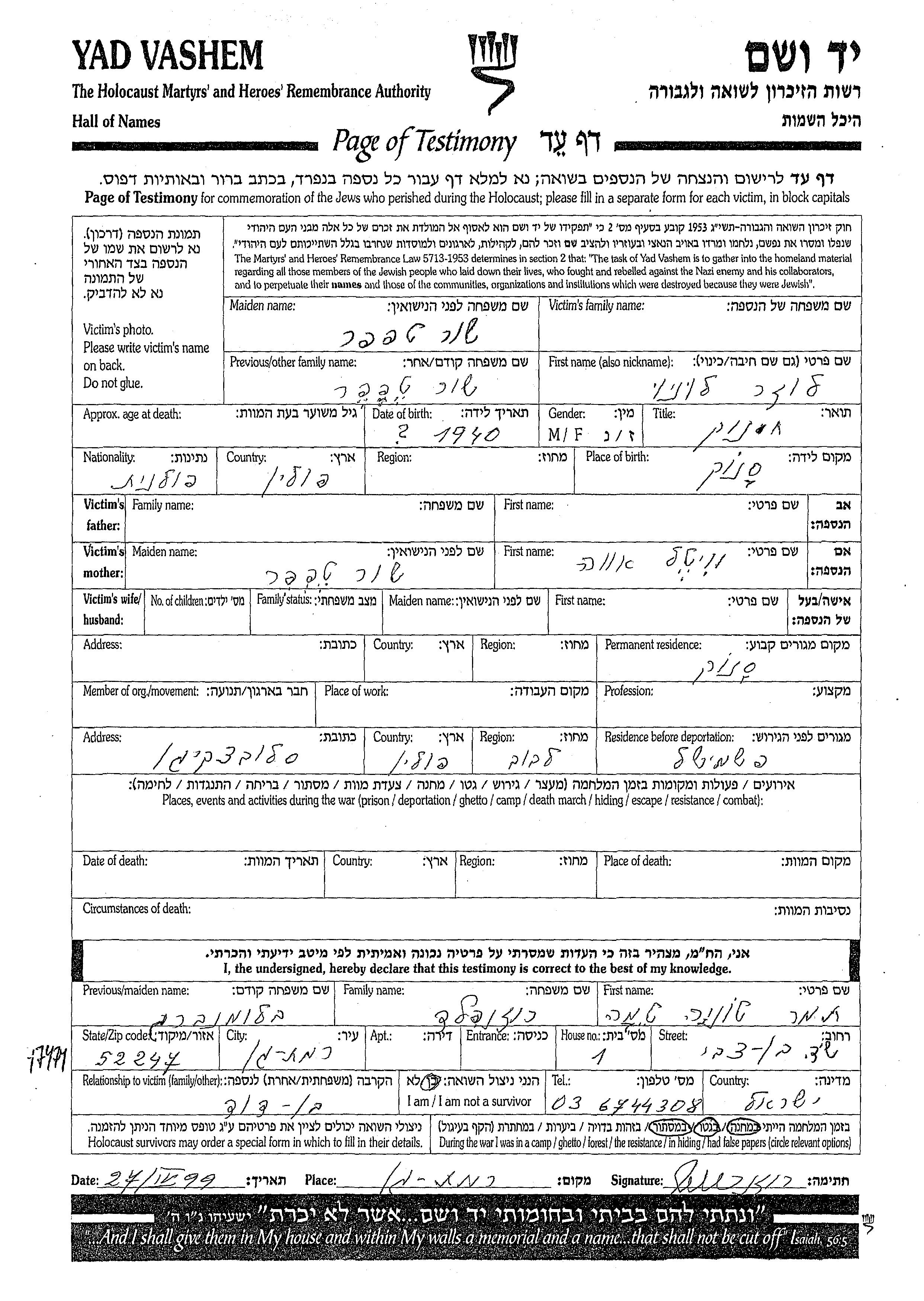 Yad Vashem - Pages of Testimony Names Memorial Collection