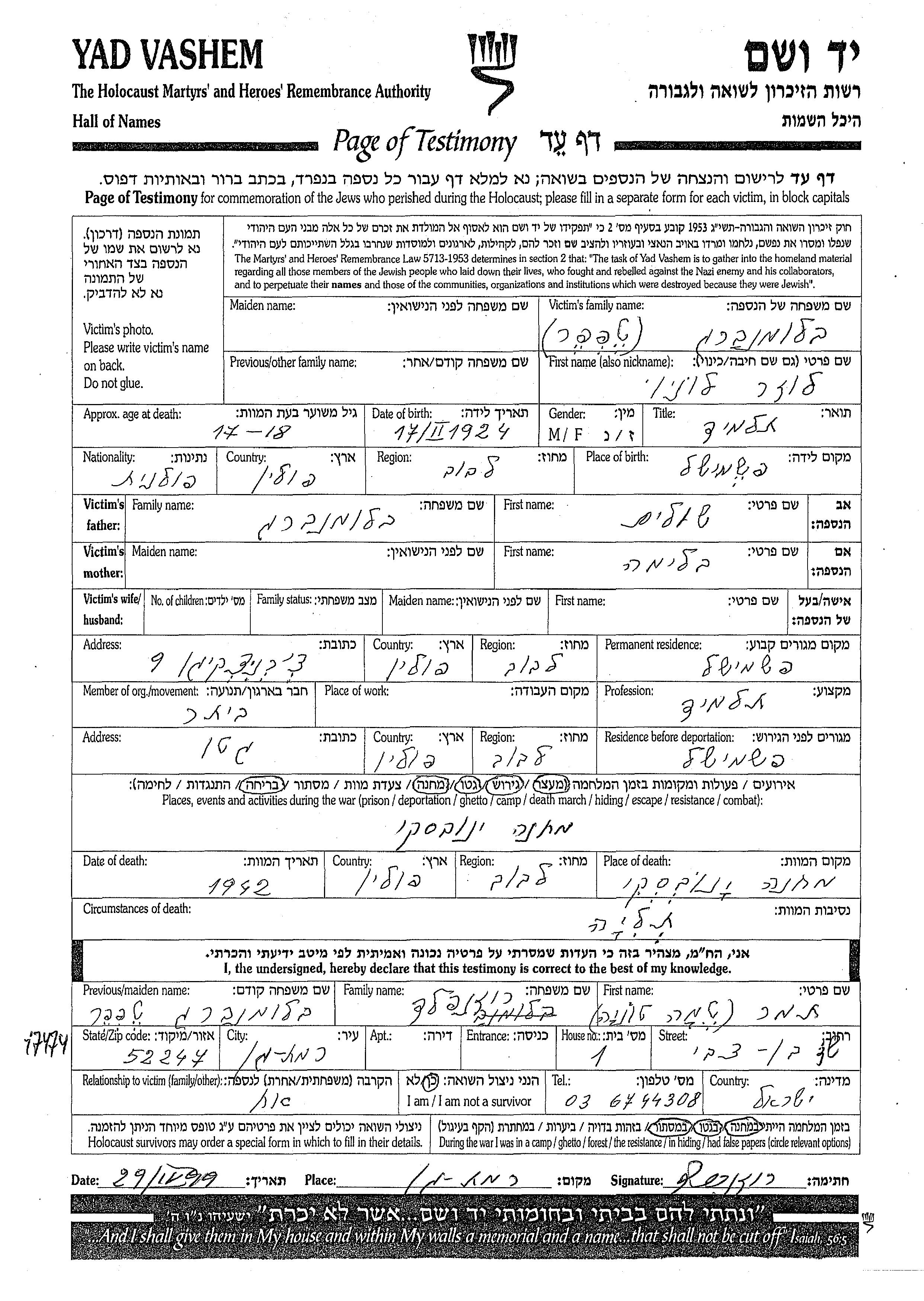 Blumenberg Tapfer Leonid Luzer 1924 Przemysl, Pologne Feuille de témoignage