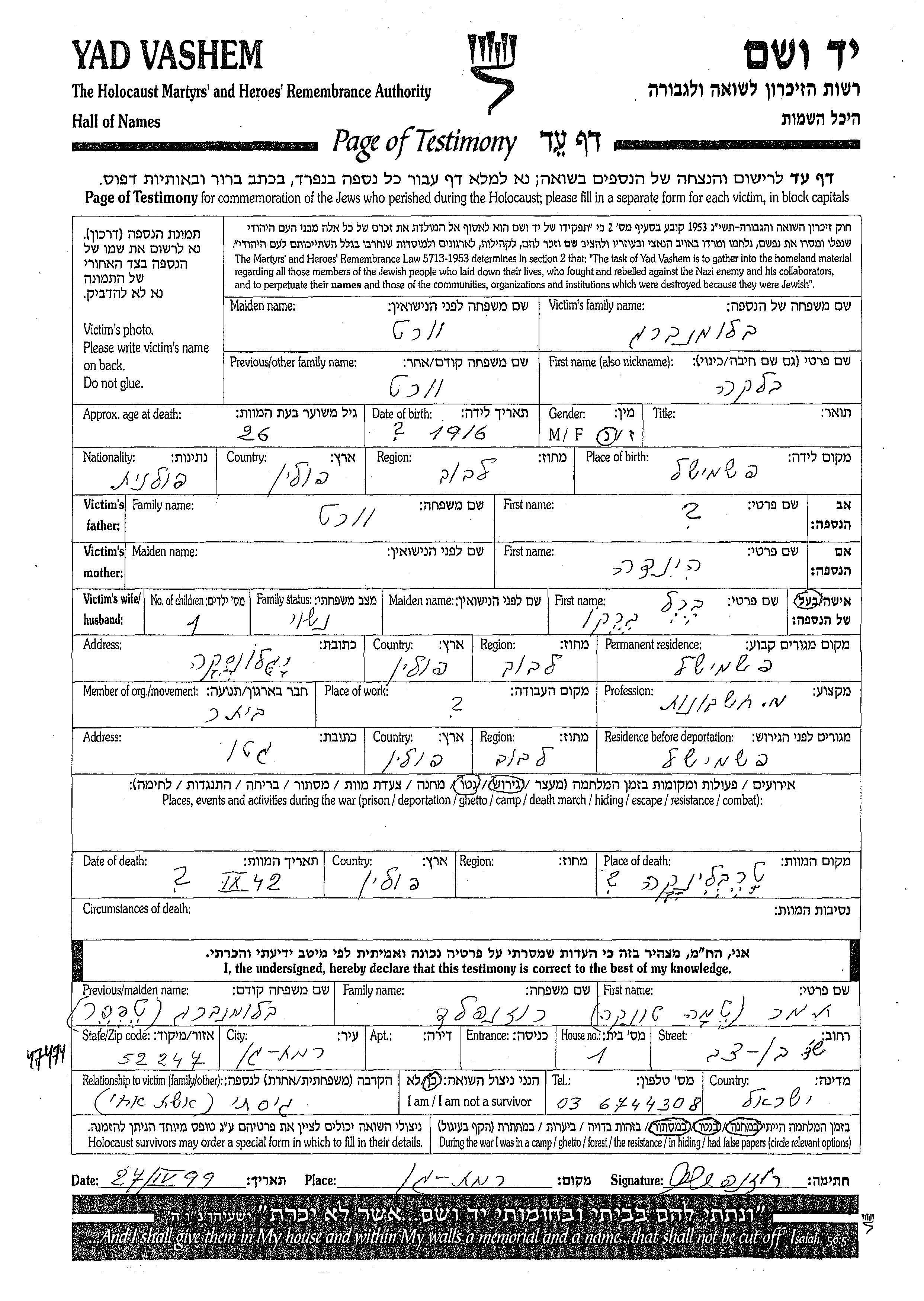 Yad Vashem - Pages of Testimony Names Memorial Collection