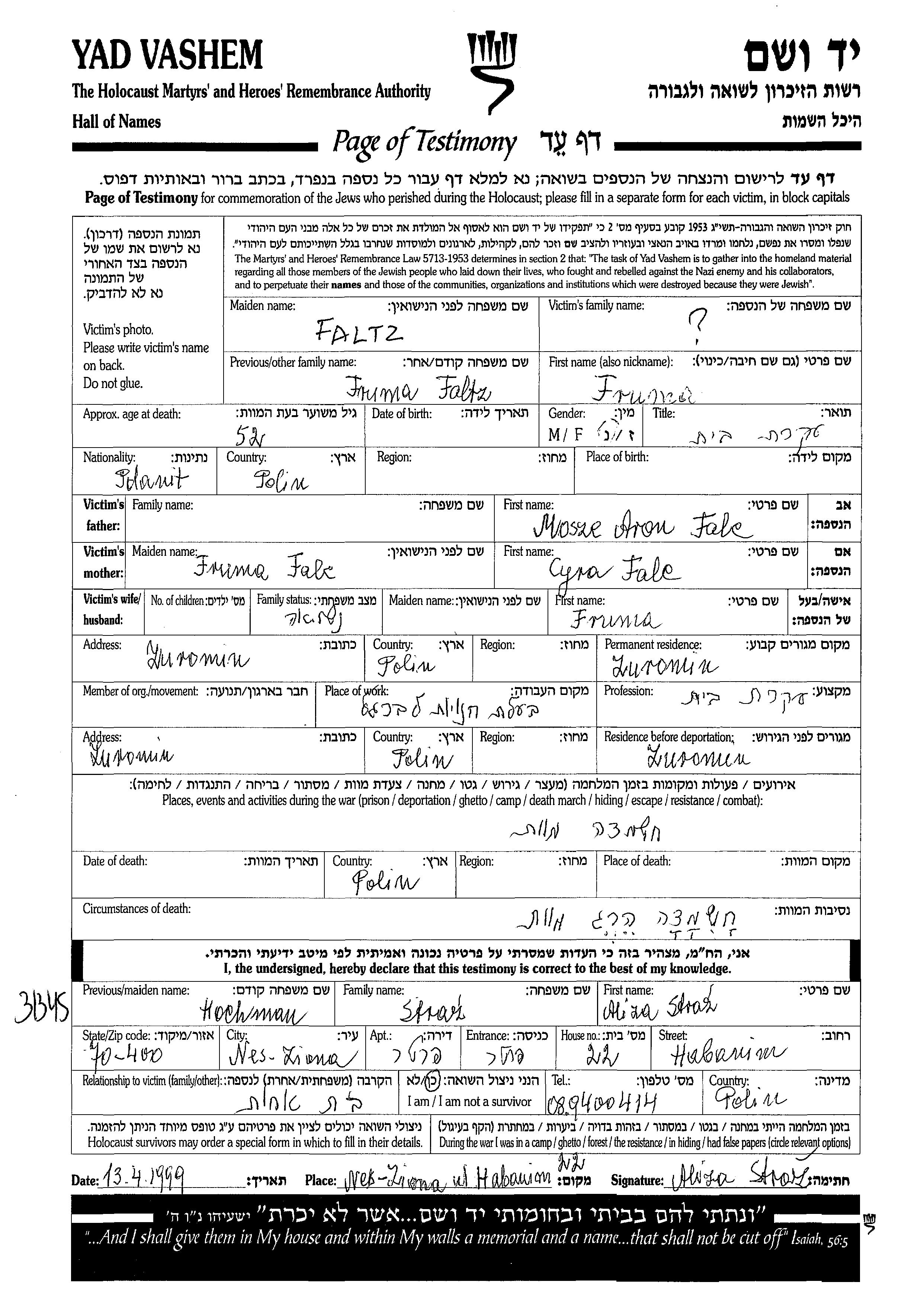 Fruma nom inconnu née Faltz est née à Pologne, fille de Mosze Aron et de Cyra. Elle était Femme au foyer et Mariée. Avant la seconde guerre mondiale elle vivait à Zuromin, Pologne. Pendant la guerre, elle était à Zuromin, Pologne.