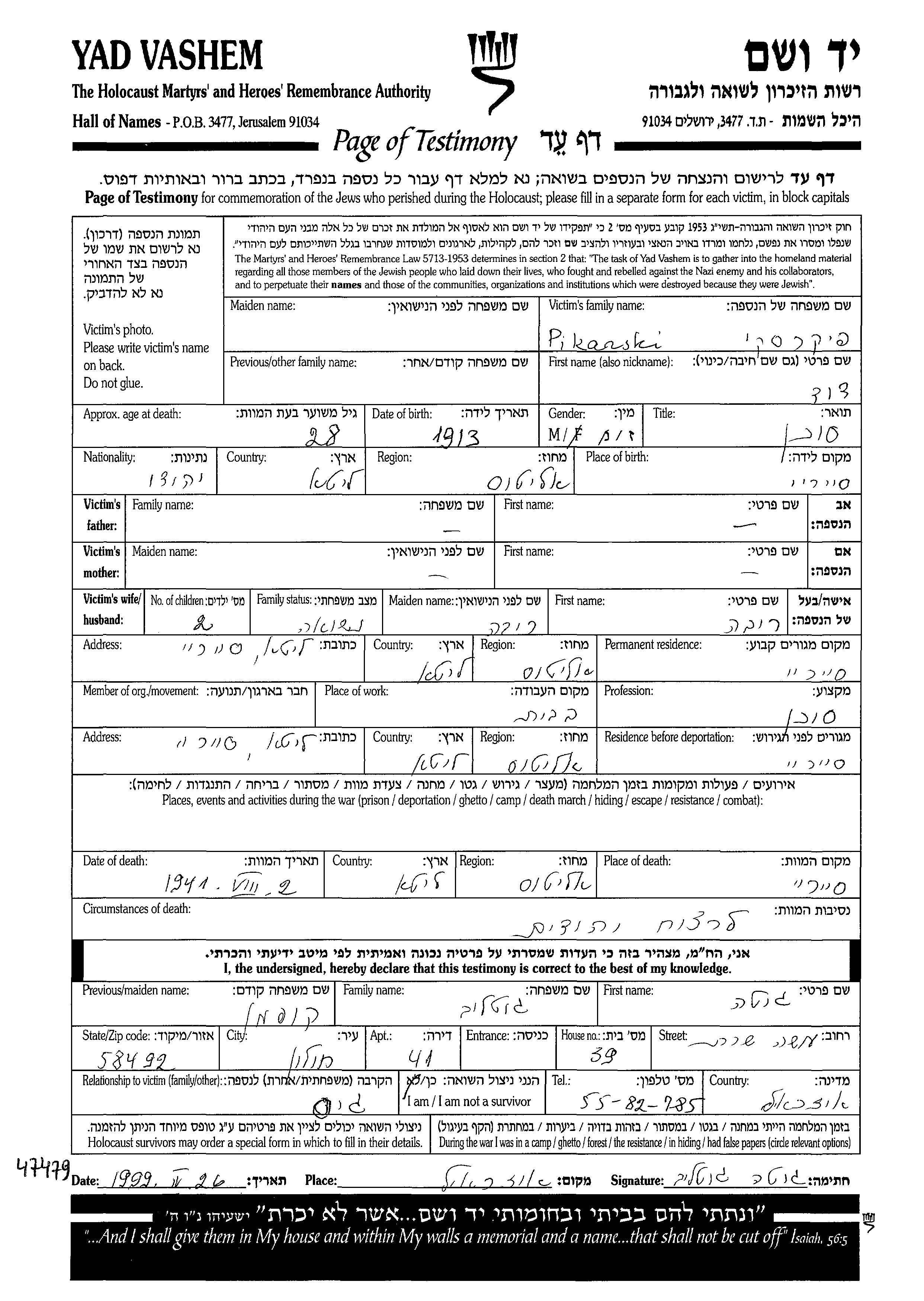 Pikarski David 1913 Seirijai, Lituanie Feuille de témoignage