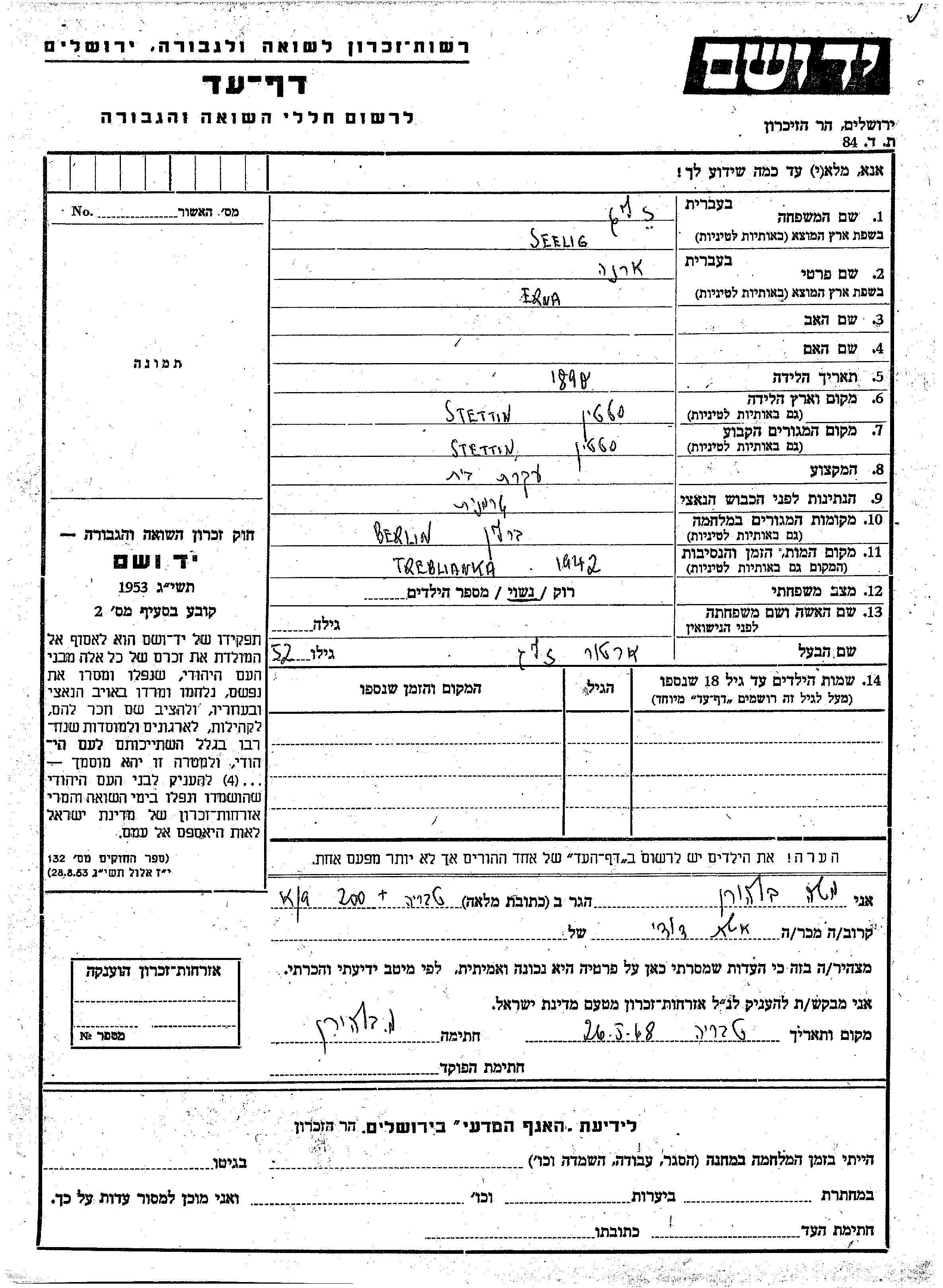 Seelig Erna 1890 Stettin, Allemagne Feuille de témoignage