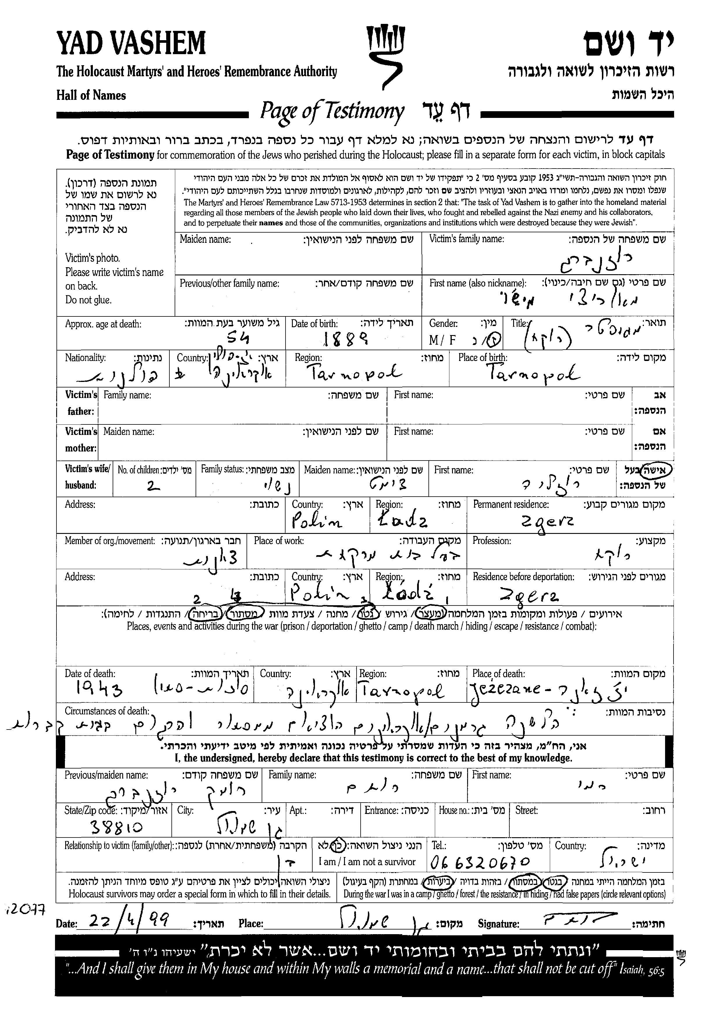 Yad Vashem - Pages of Testimony Names Memorial Collection