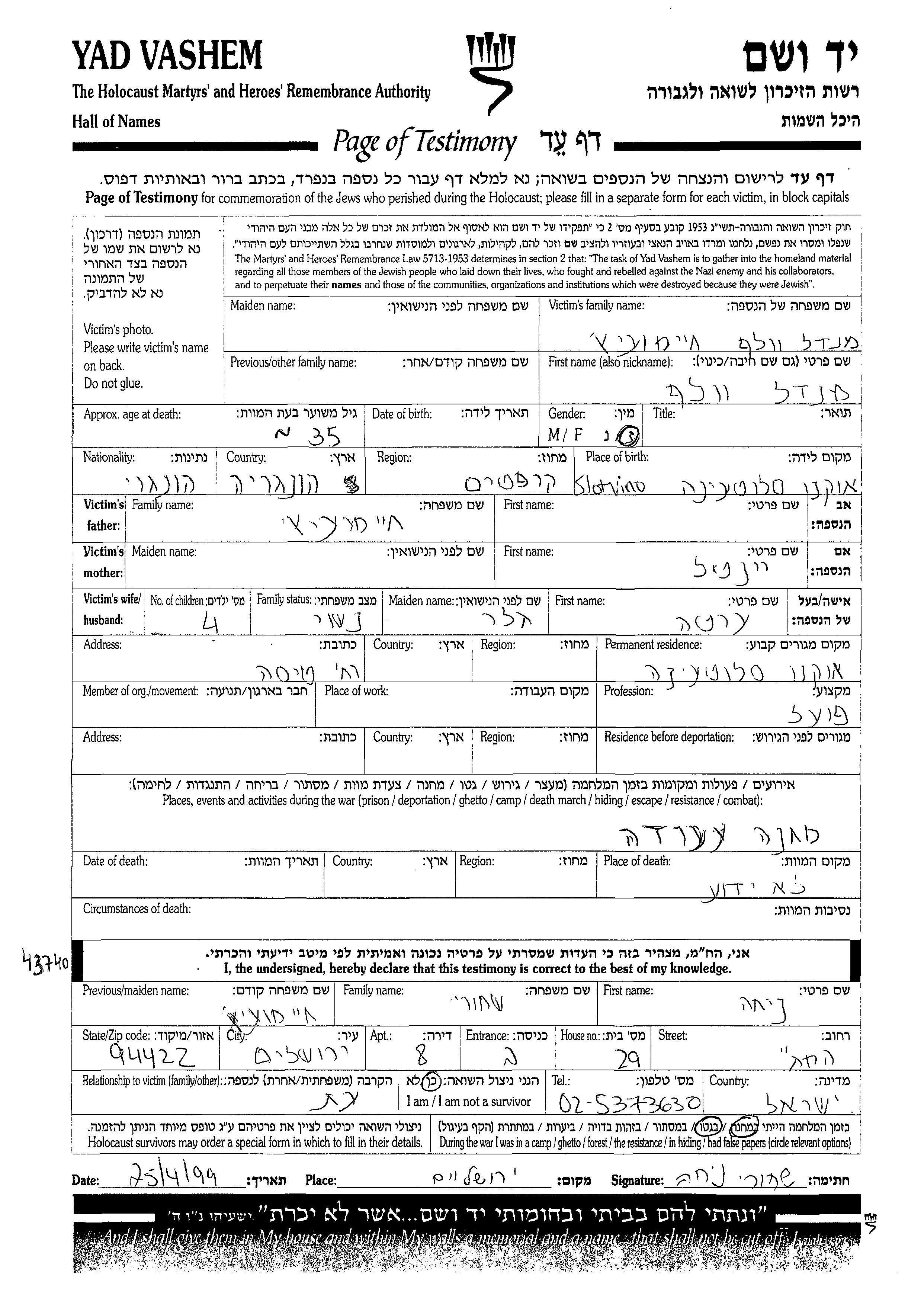 Yad Vashem - Pages of Testimony Names Memorial Collection