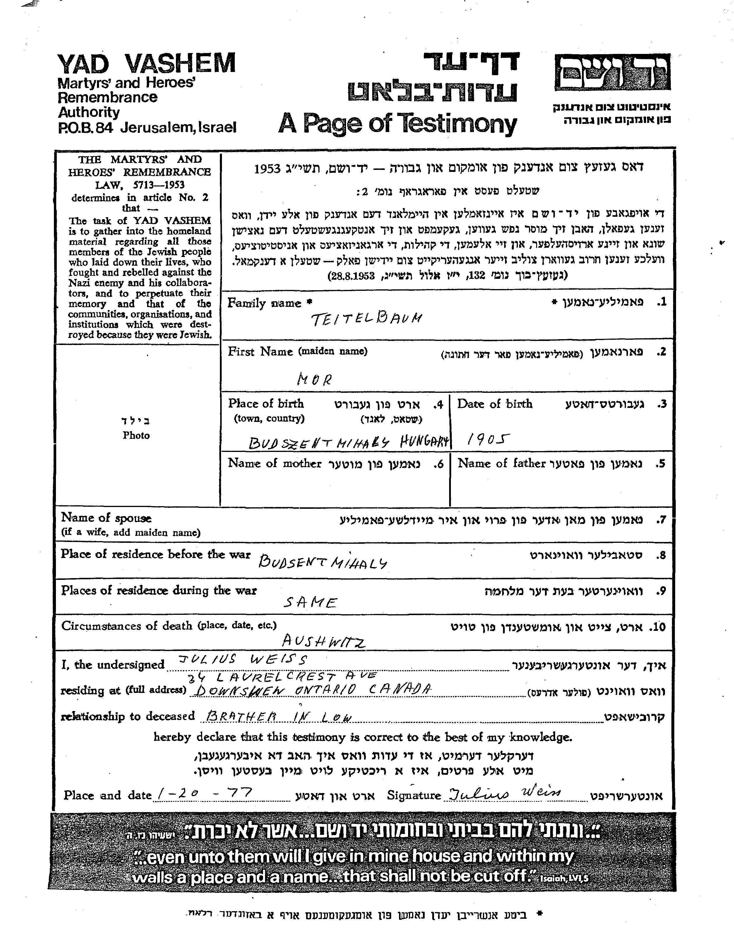 Teitelbaum Mor 1905 Budszentmihaly, Hongrie Feuille de témoignage