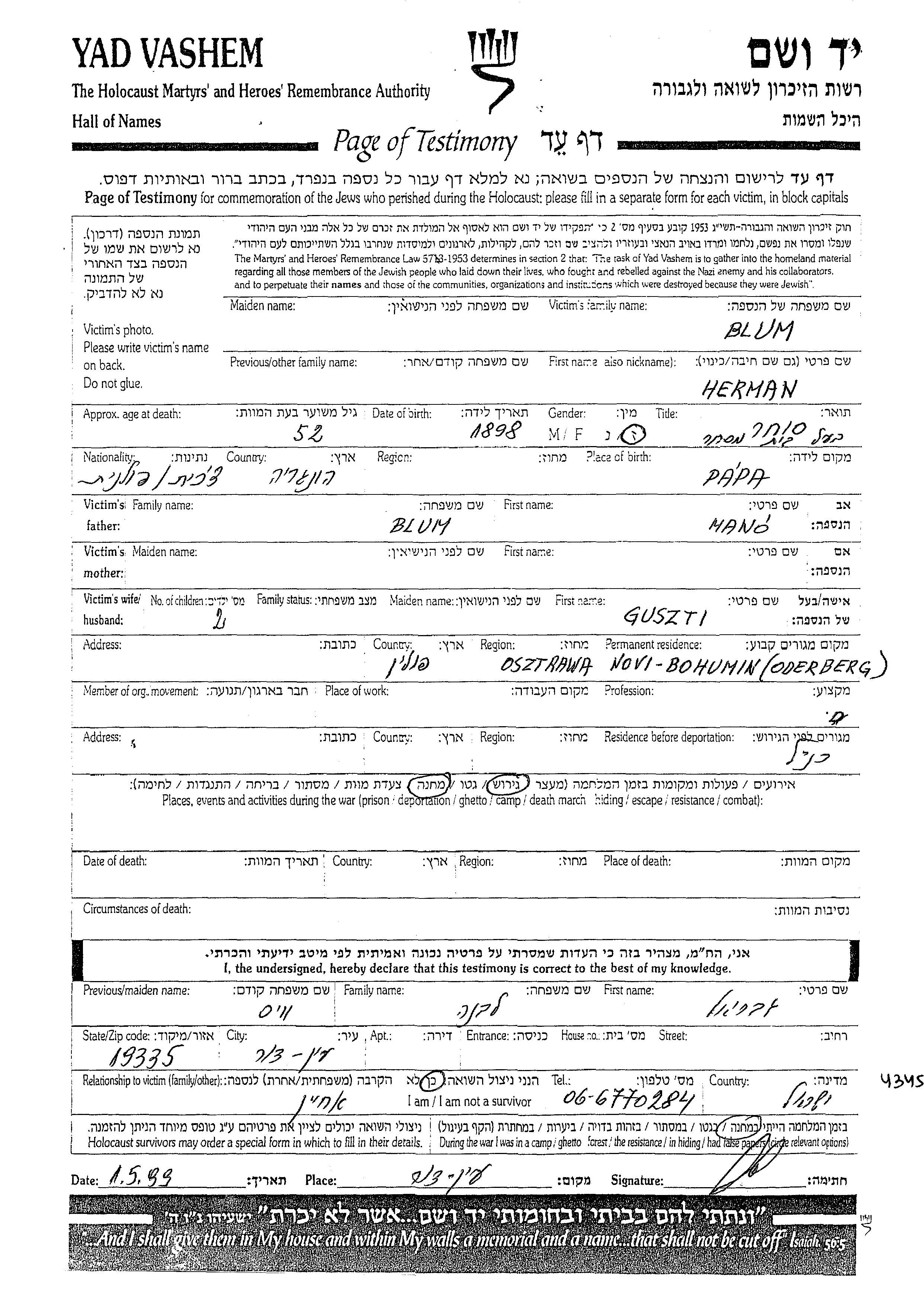 Blum Herman Novy Bohumin, Tchécoslovaquie Feuille de témoignage