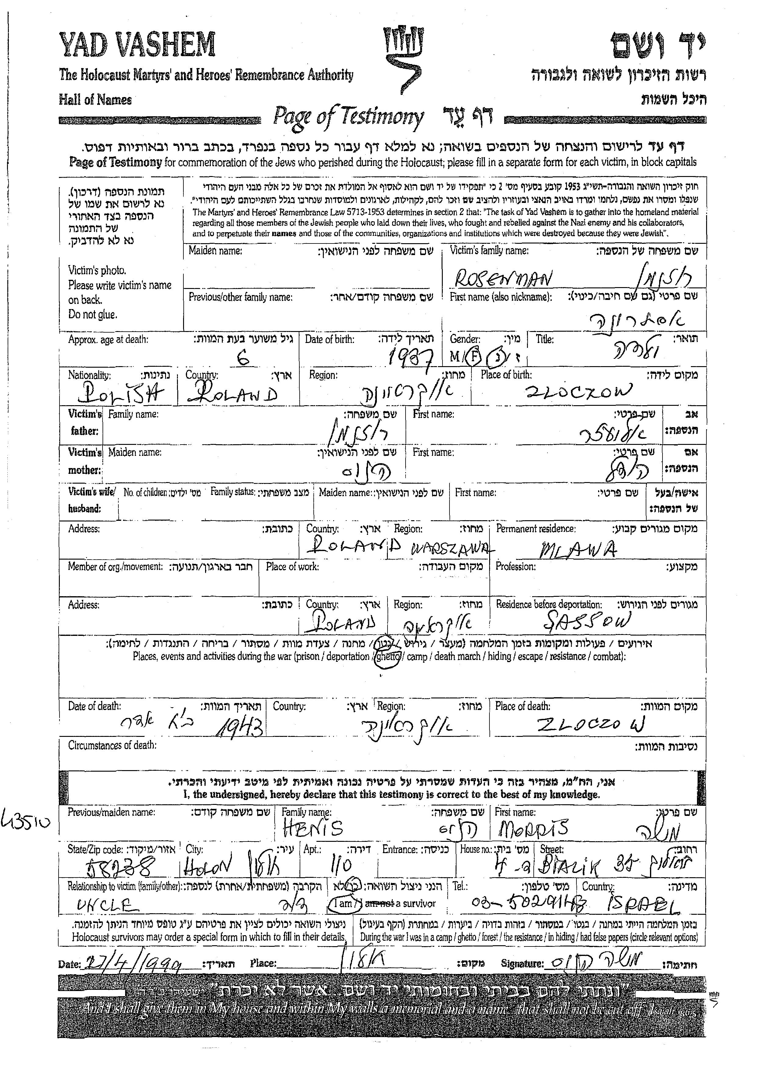 Rosenman Esterina 1937 Mlawa, Pologne Feuille de témoignage