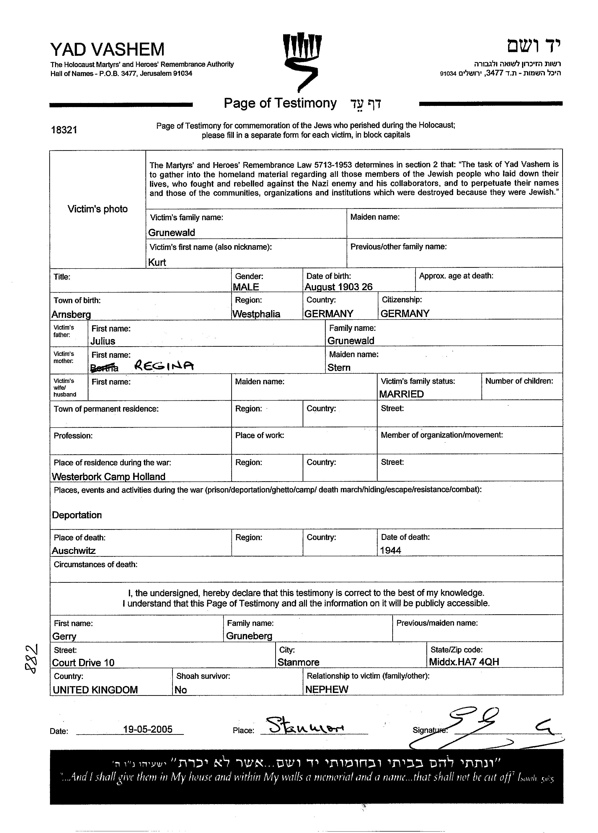 Kurt Grunewald est né à Arnsberg, Allemagne en 1903, fils de Julius et de Bertha née Stern. Il était Marié. Au cours de la guerre, il était à Westerbork, Pays Bas.
