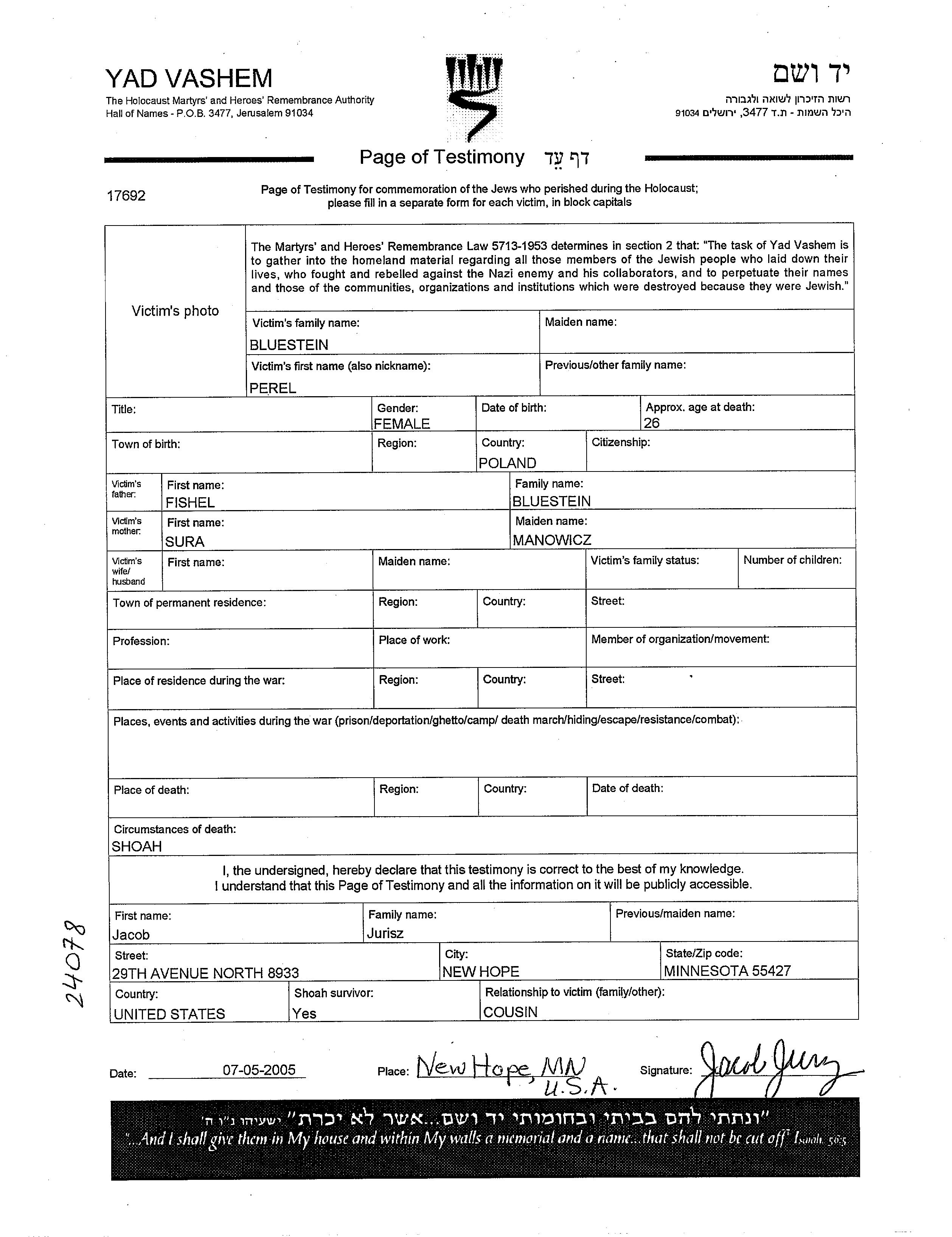 Bluestein Perel endroit inconnu, Feuille de témoignage (digitale-signée)