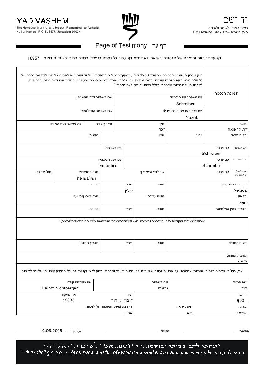 Schreiber Yuzek Przemysl, Pologne Feuille de témoignage (digitale)