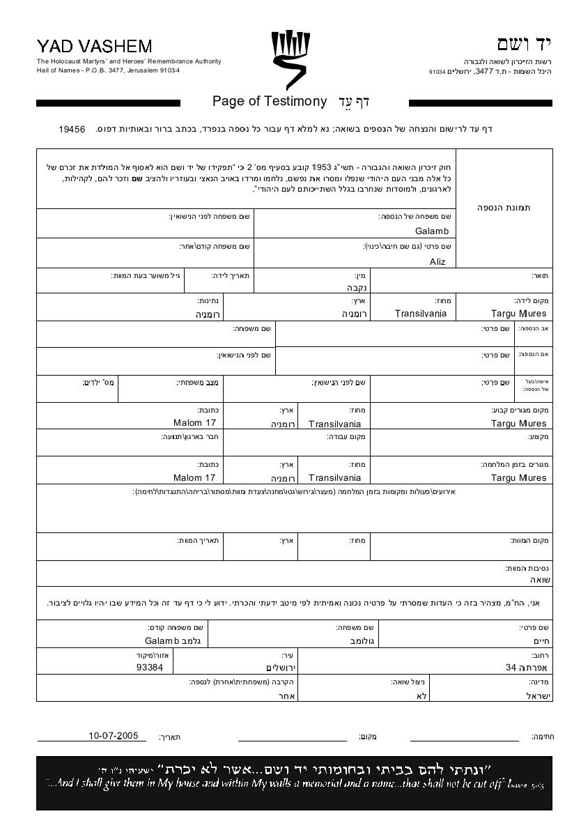 Galamb Aliz Targu Mures, Roumanie Feuille de témoignage (digitale)
