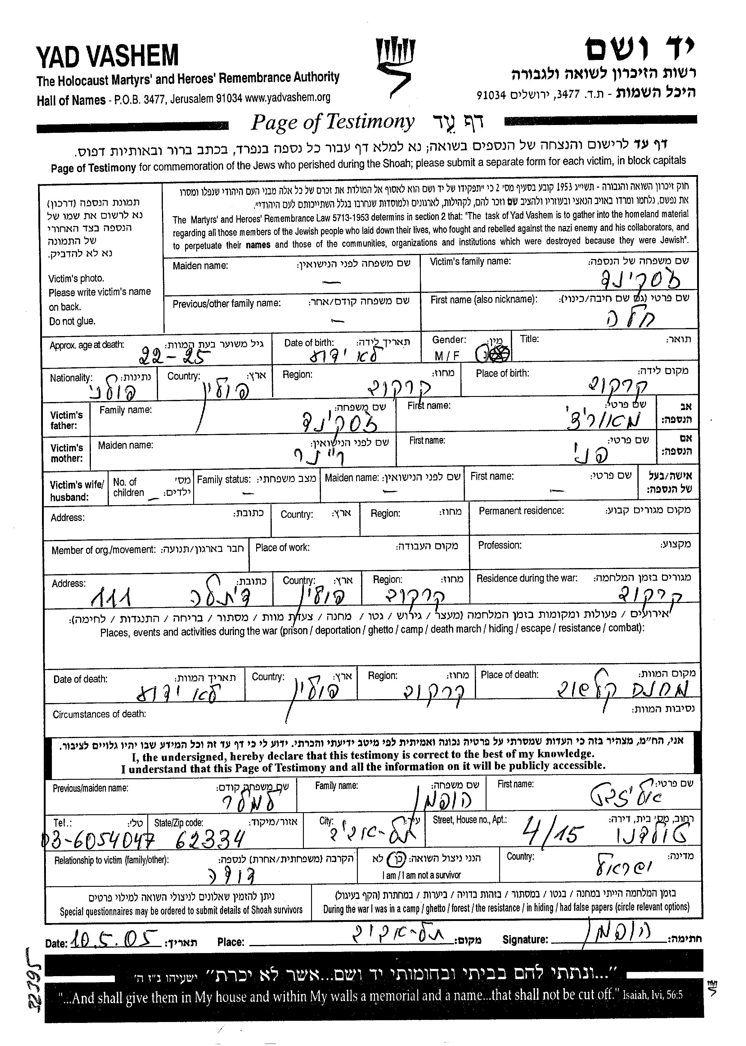 Yad Vashem - Pages of Testimony Names Memorial Collection