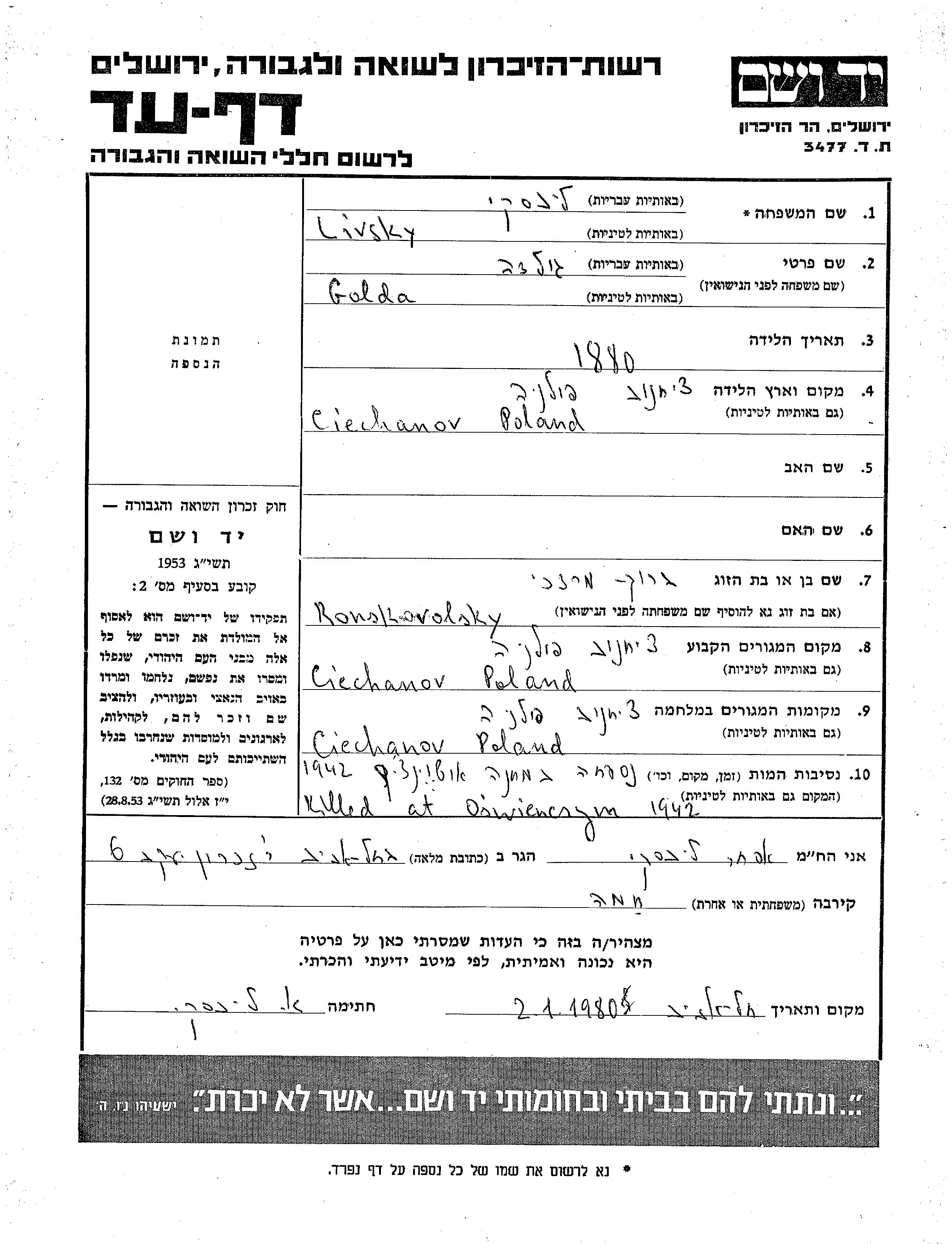 Golda Livsky née Ronskovolsky est née à Ciechanow, Pologne en 1880. Elle était Mariée à Barukh Mordekhai. Avant la seconde guerre mondiale elle vivait à Ciechanow, Pologne. Pendant la guerre, elle était à Ciechanow, Pologne.