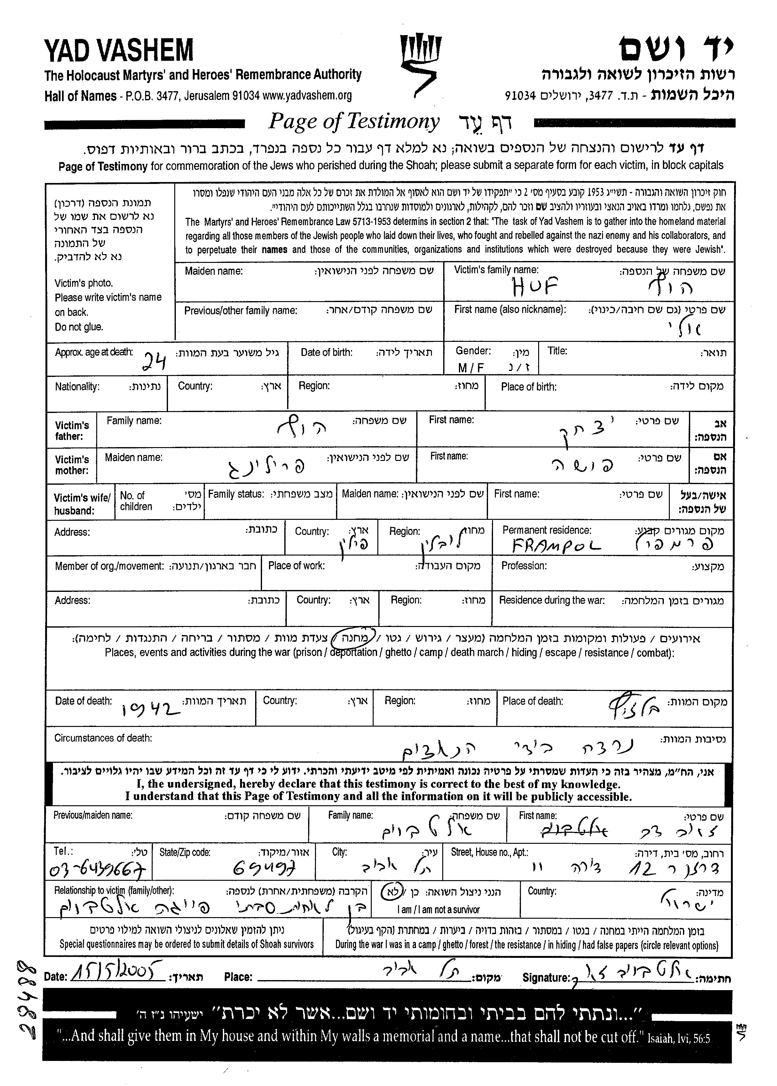 Lieu de résidence pendant la guerre/Shoah