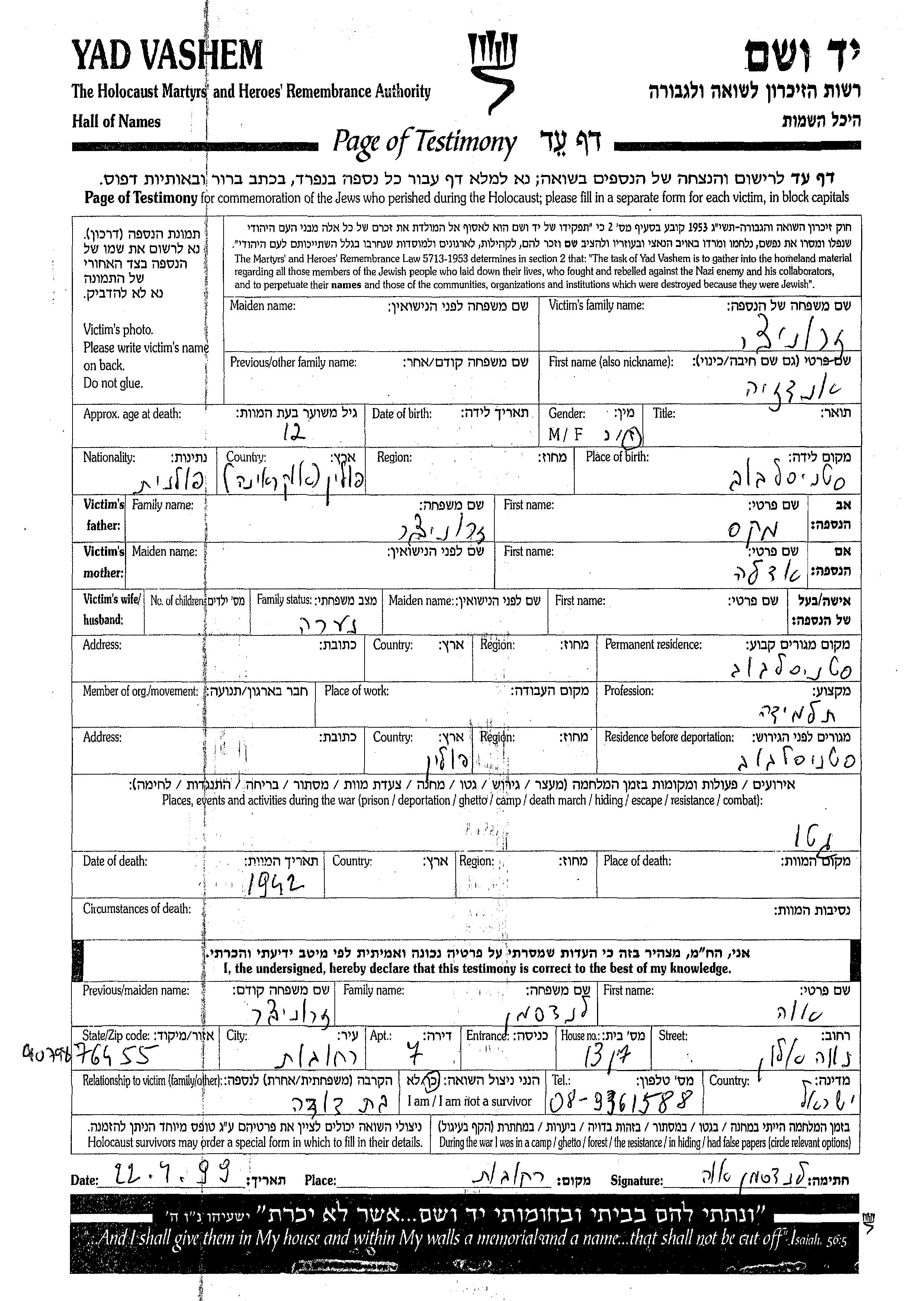 Yad Vashem - Pages of Testimony Names Memorial Collection