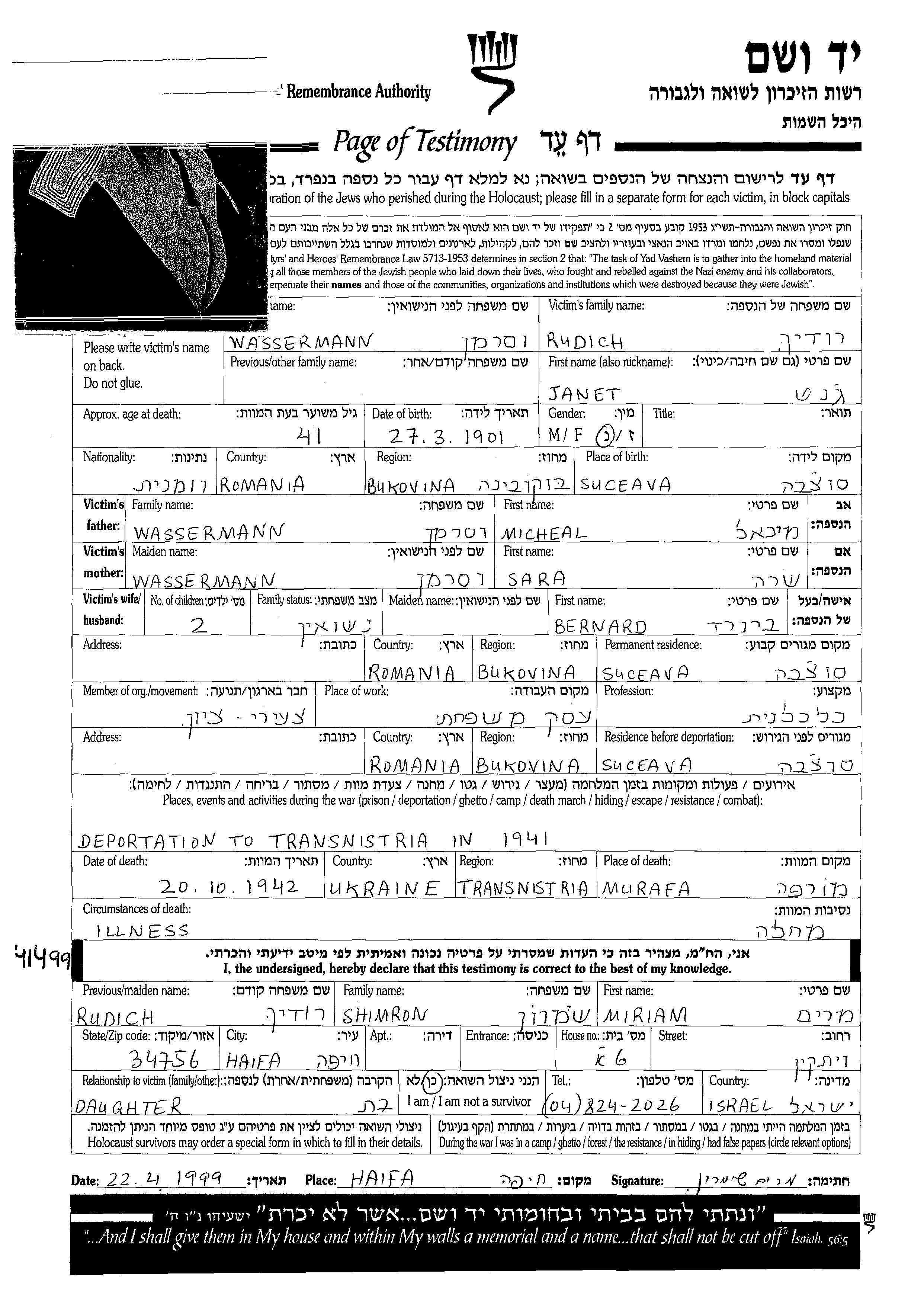 Zhanet Rudikh née Wassermann est née à Suceava, Roumanie en 1901, fille de Micheal et de Sara. Elle était Économiste et Mariée à Bernard. Avant la seconde guerre mondiale elle vivait à Suceava, Roumanie. Pendant la guerre, elle était à Suceava, Roumanie.