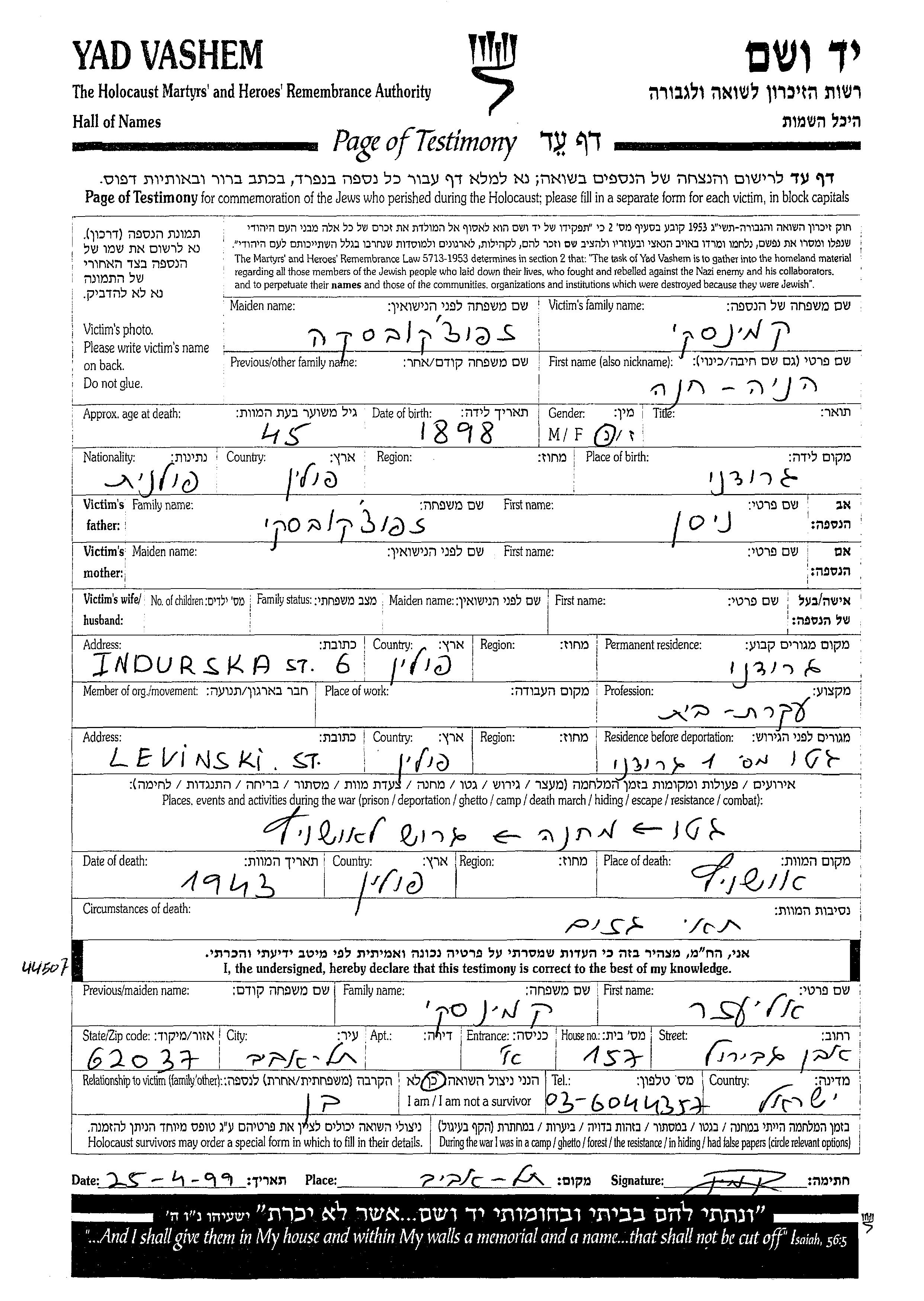 Yad Vashem - Pages of Testimony Names Memorial Collection