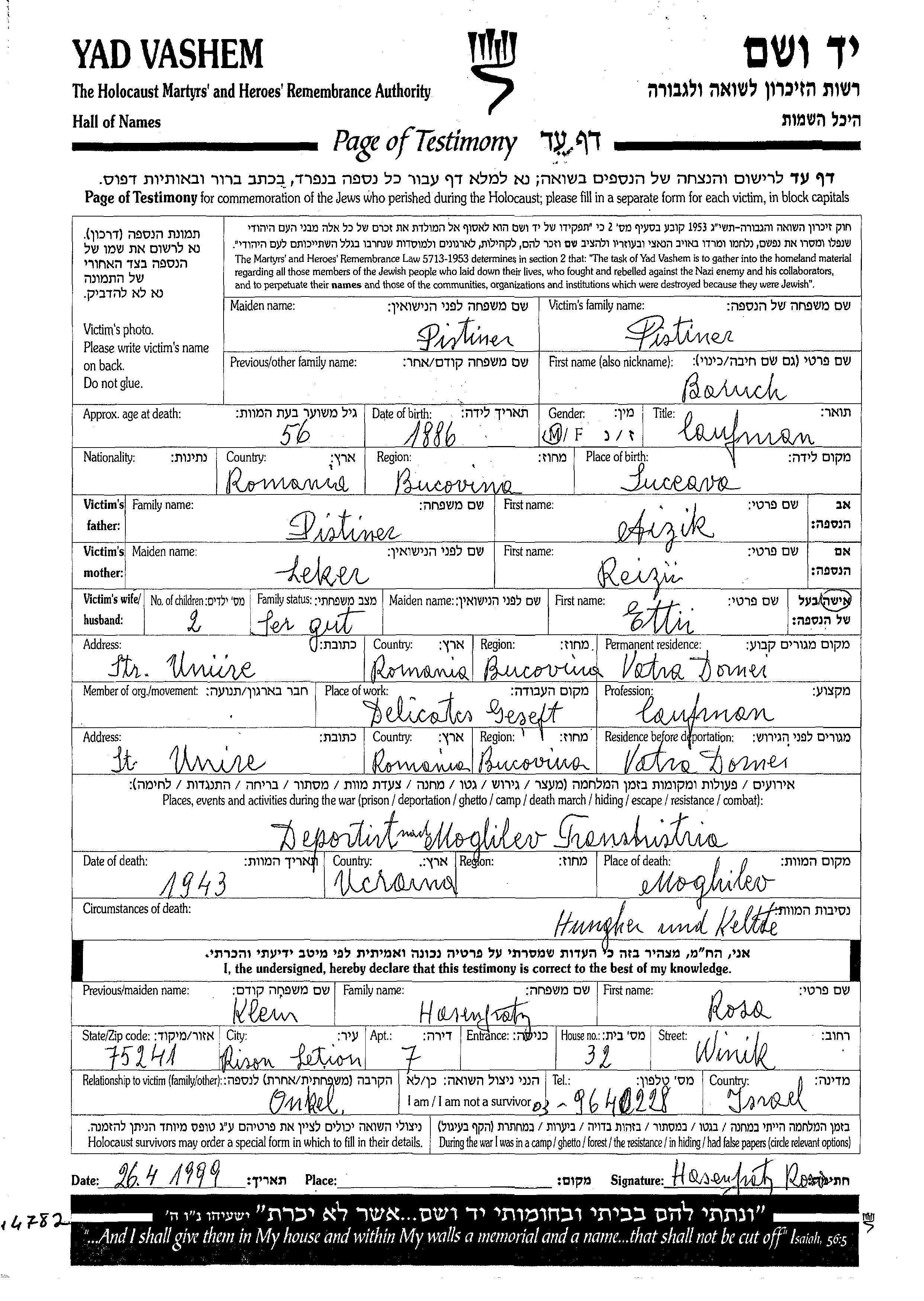 Baruch Pistiner est né à Suceava, Roumanie en 1886, fils de Aizik et de Reizu née Leker. Il était Commerçant/e. Avant la seconde guerre mondiale il vivait à Vatra Dornei, Roumanie. Au cours de la guerre, il était à Vatra Dornei, Roumanie.