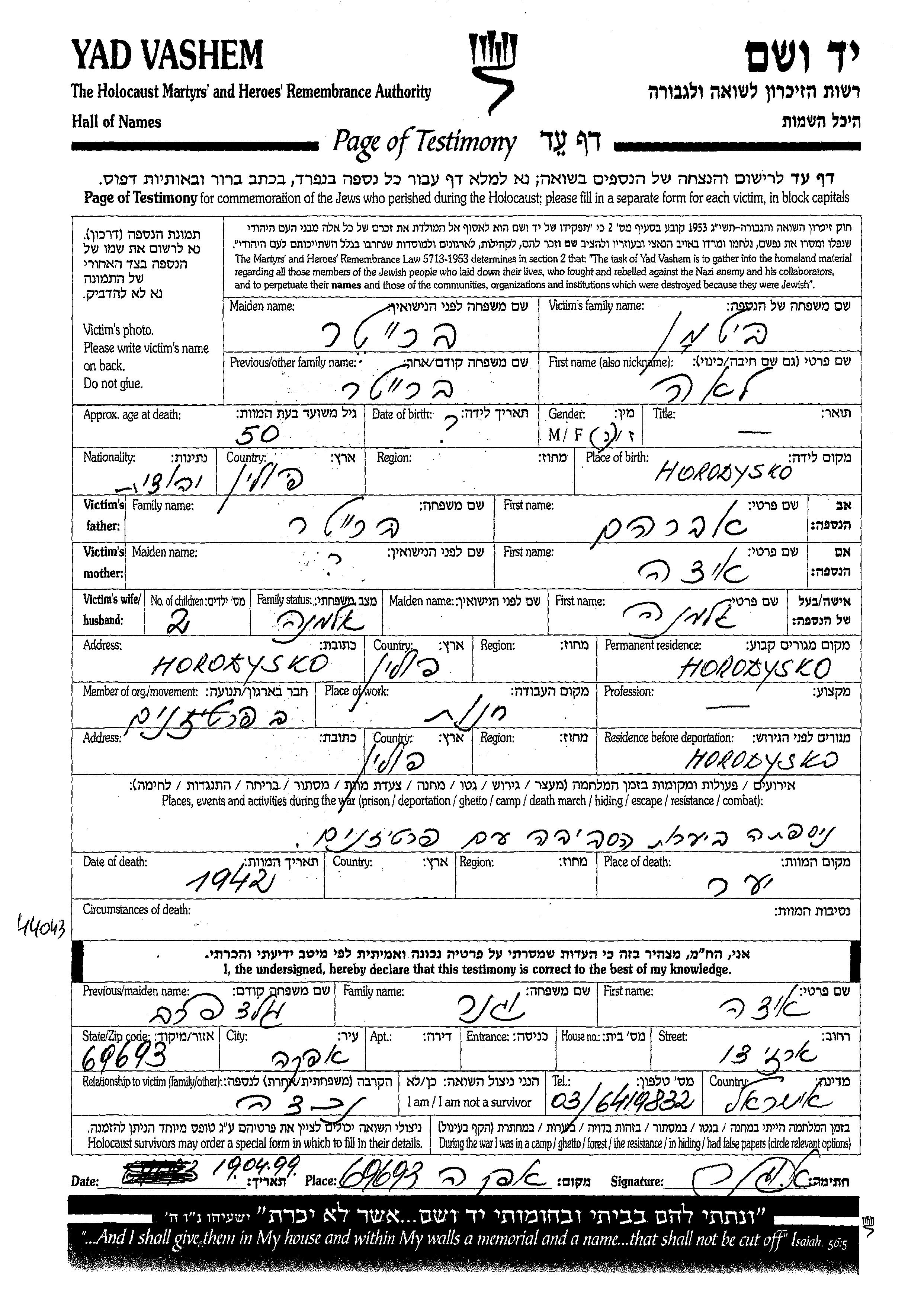 Bitman Lea Horodysko, Pologne Feuille de témoignage