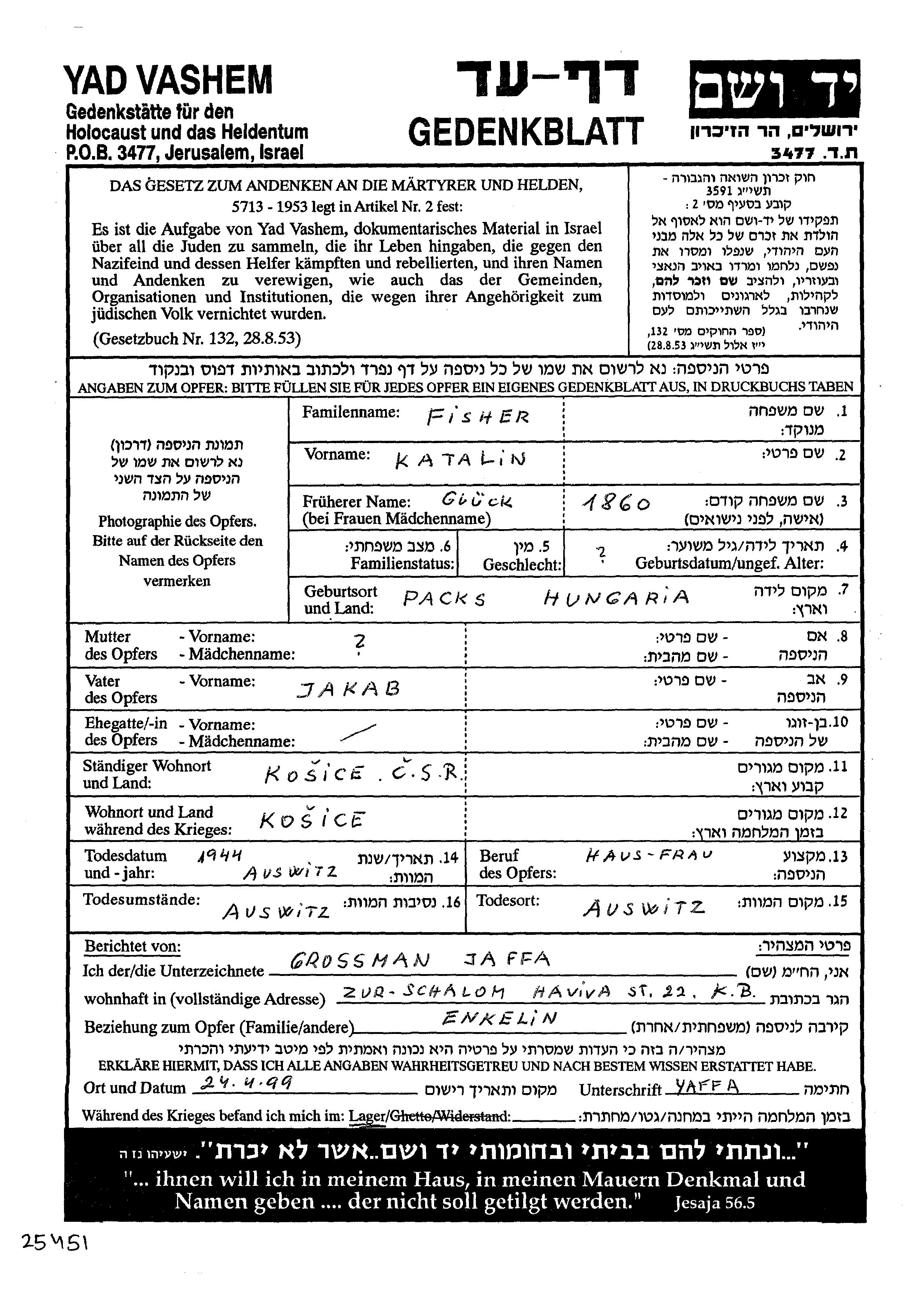 Fisher Katalin 1860 Kassa, Tchécoslovaquie Feuille de témoignage