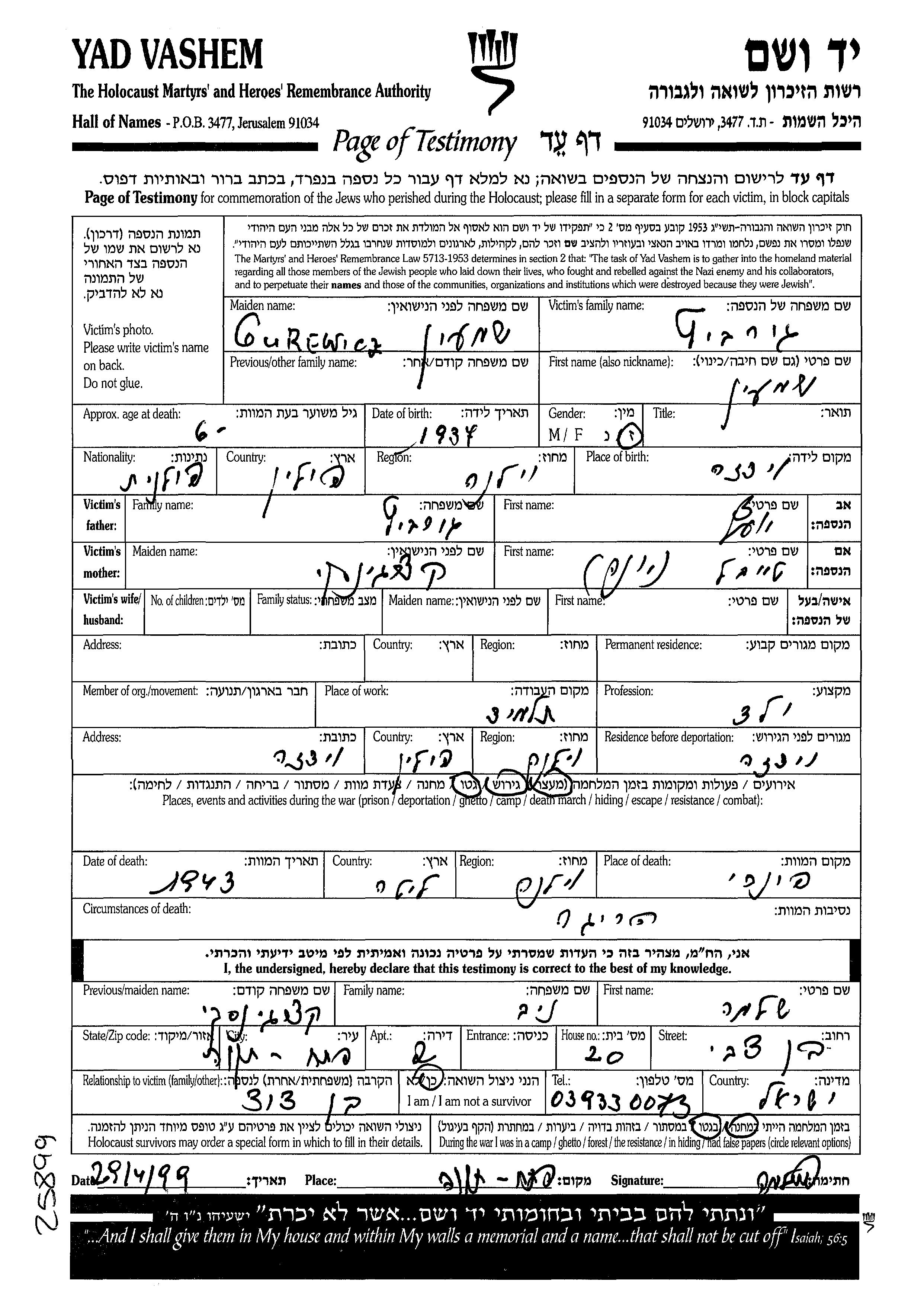 Gurewicz Shimon 1937 endroit inconnu, Feuille de témoignage