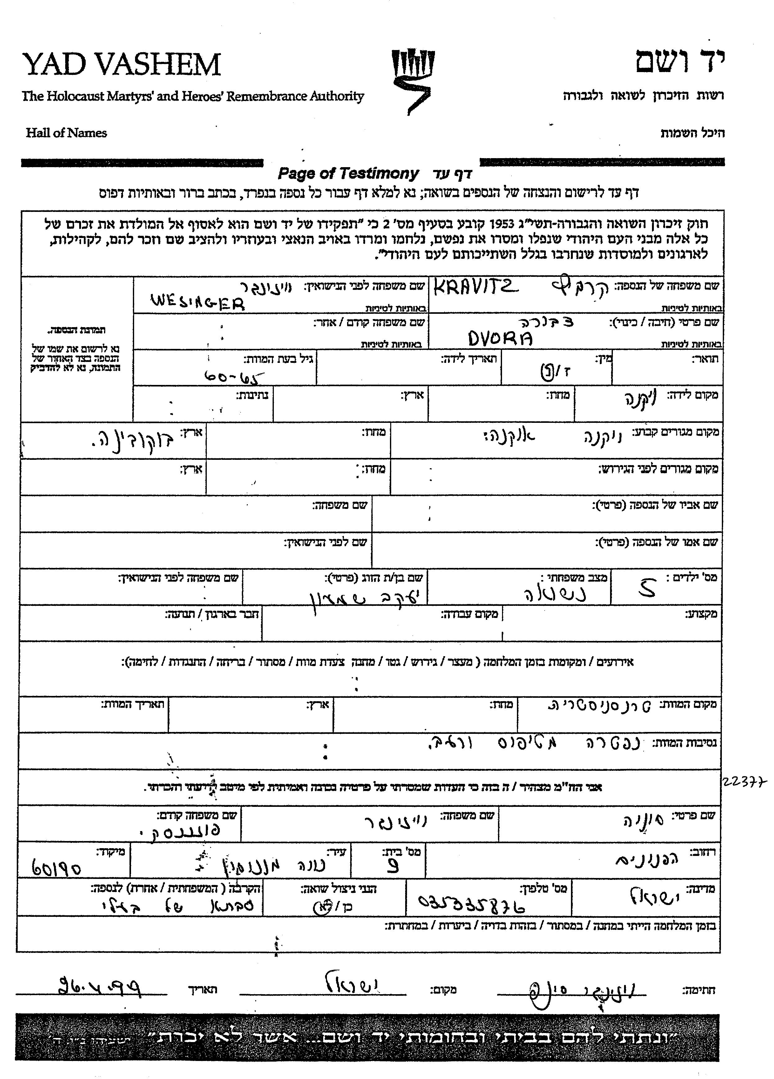 Dvora Kravetz est née à Ocna, Roumanie. Elle était Mariée à Shimon Yaakov. Avant la seconde guerre mondiale elle vivait à Ocna, Roumanie.