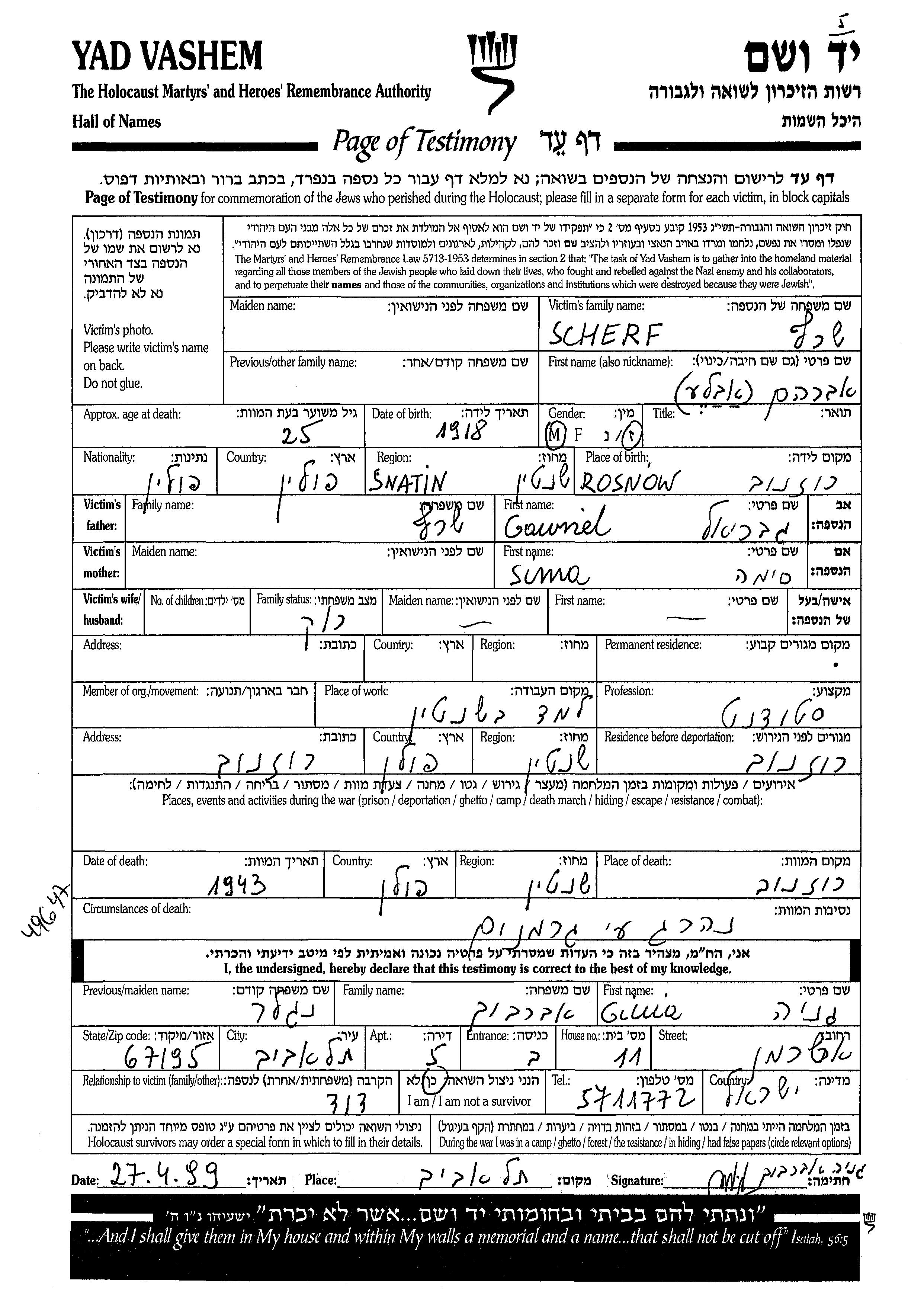 Sharf Aba Avraham 1918 endroit inconnu, Feuille de témoignage