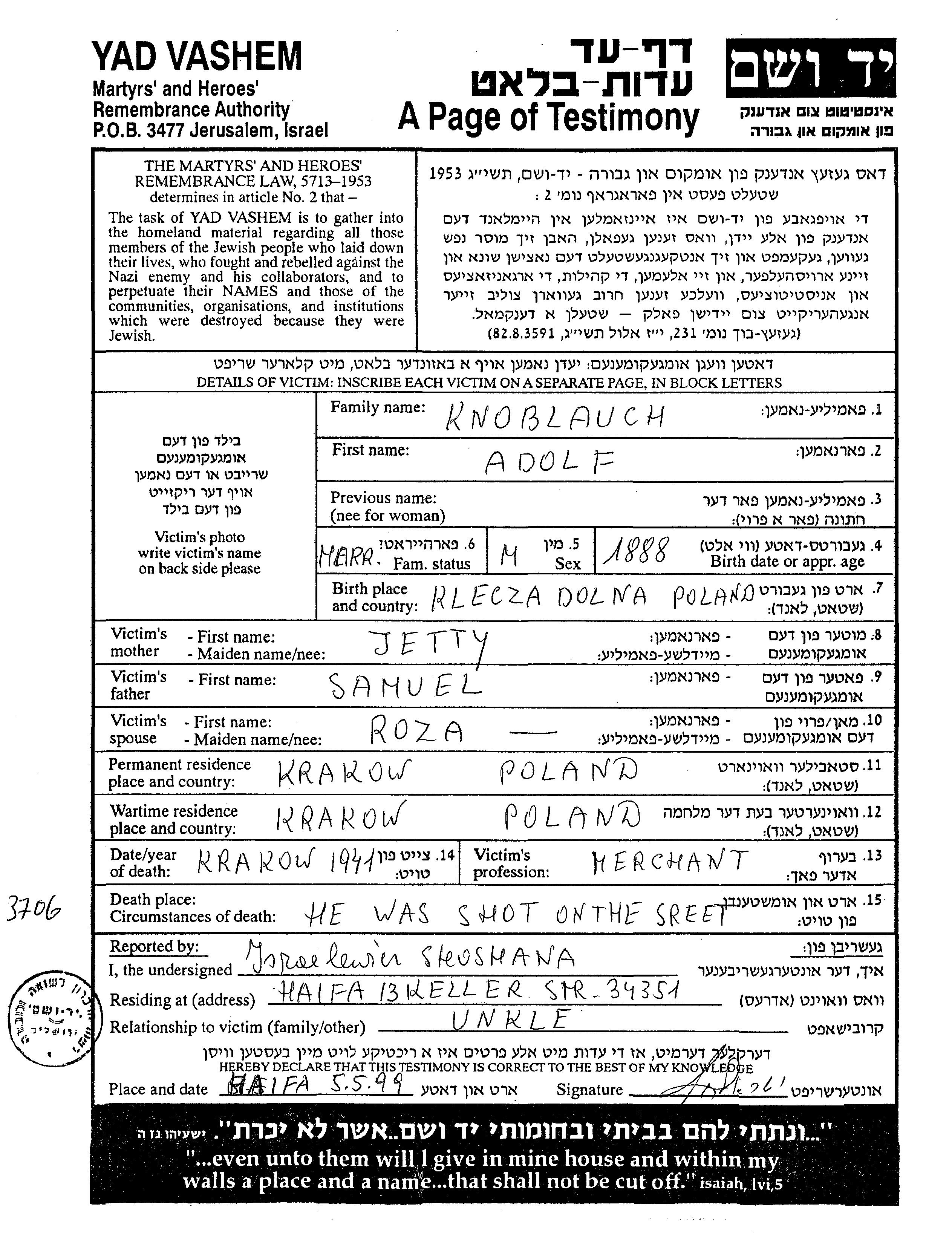 Adolf Knoblauch est né à Klecza Dolna, Pologne en 1888, fils de Samuel et de Jetty. Il était Commerçant/e et Mariée à Roza. Avant la seconde guerre mondiale il vivait à Krakow, Pologne. Au cours de la guerre, il était à Krakow, Pologne.