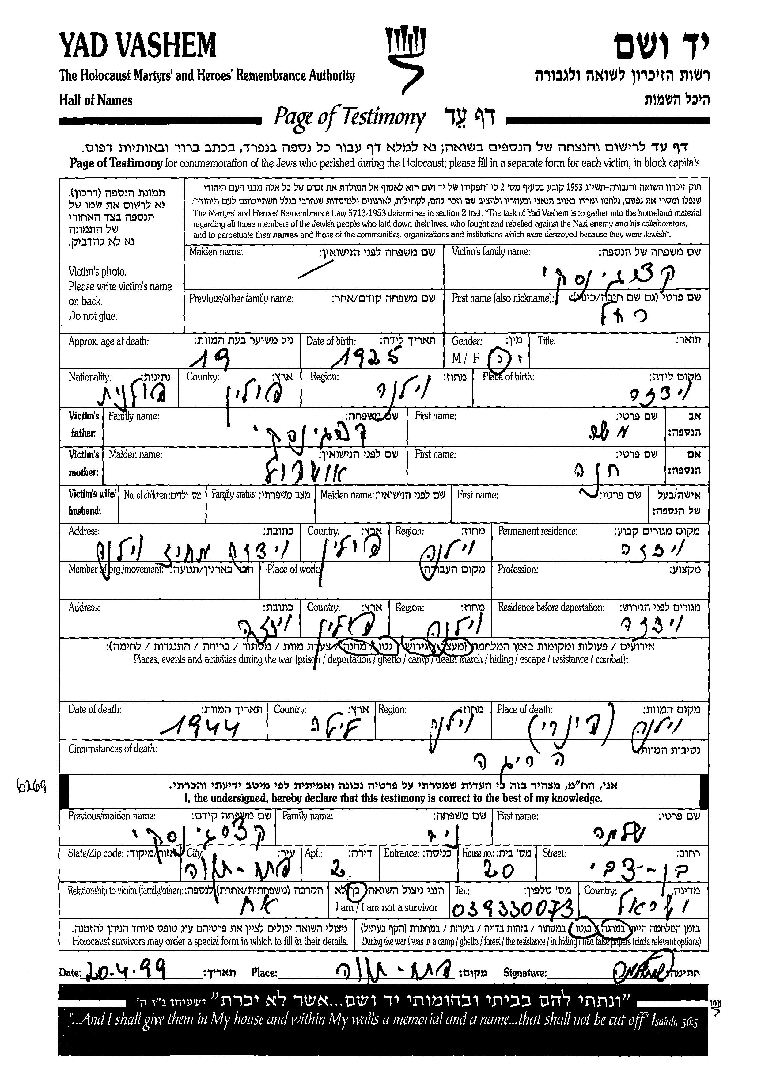 Yad Vashem - Pages of Testimony Names Memorial Collection