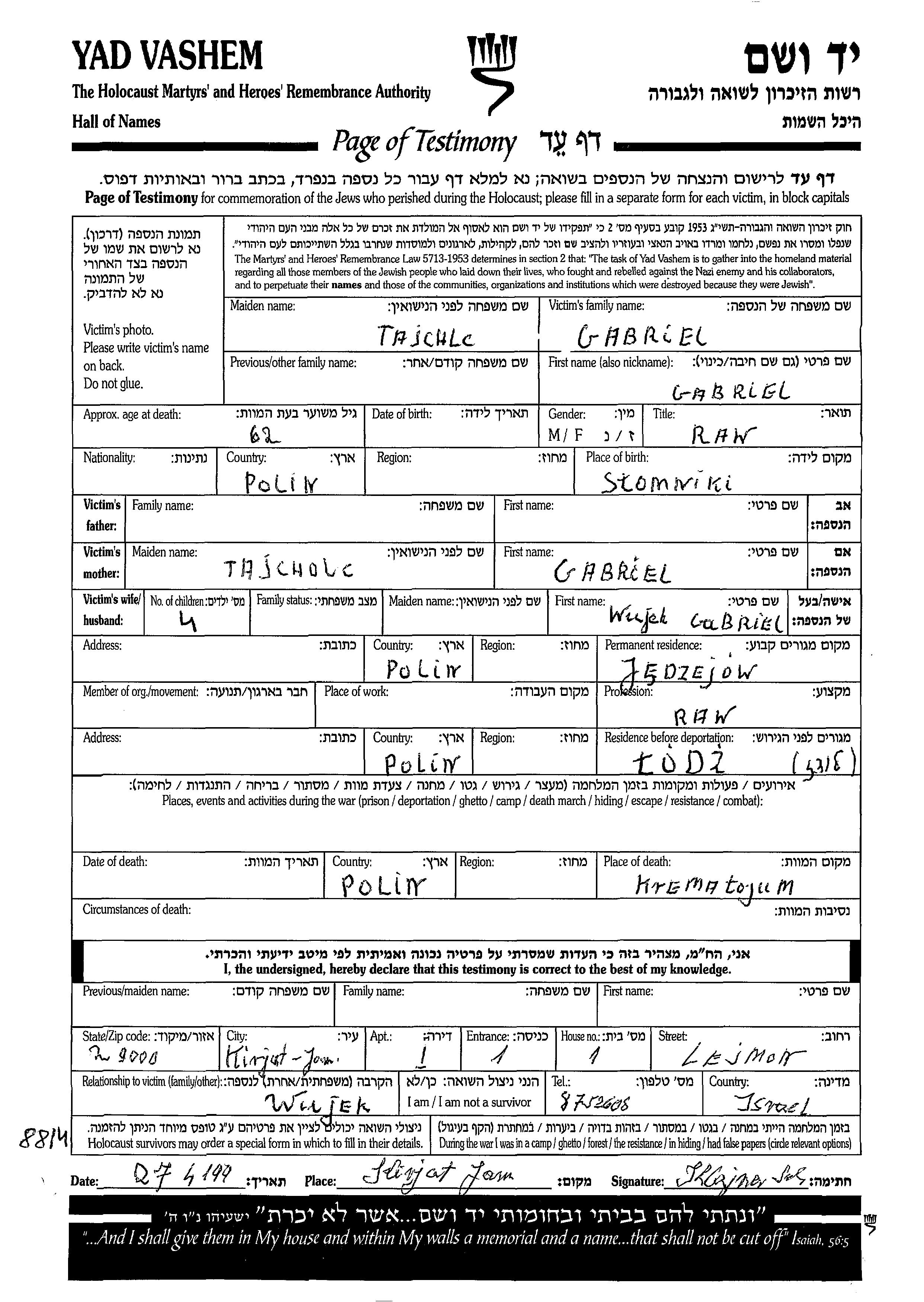 Tajcholc Gabriel Jendzejow, Pologne Feuille de témoignage