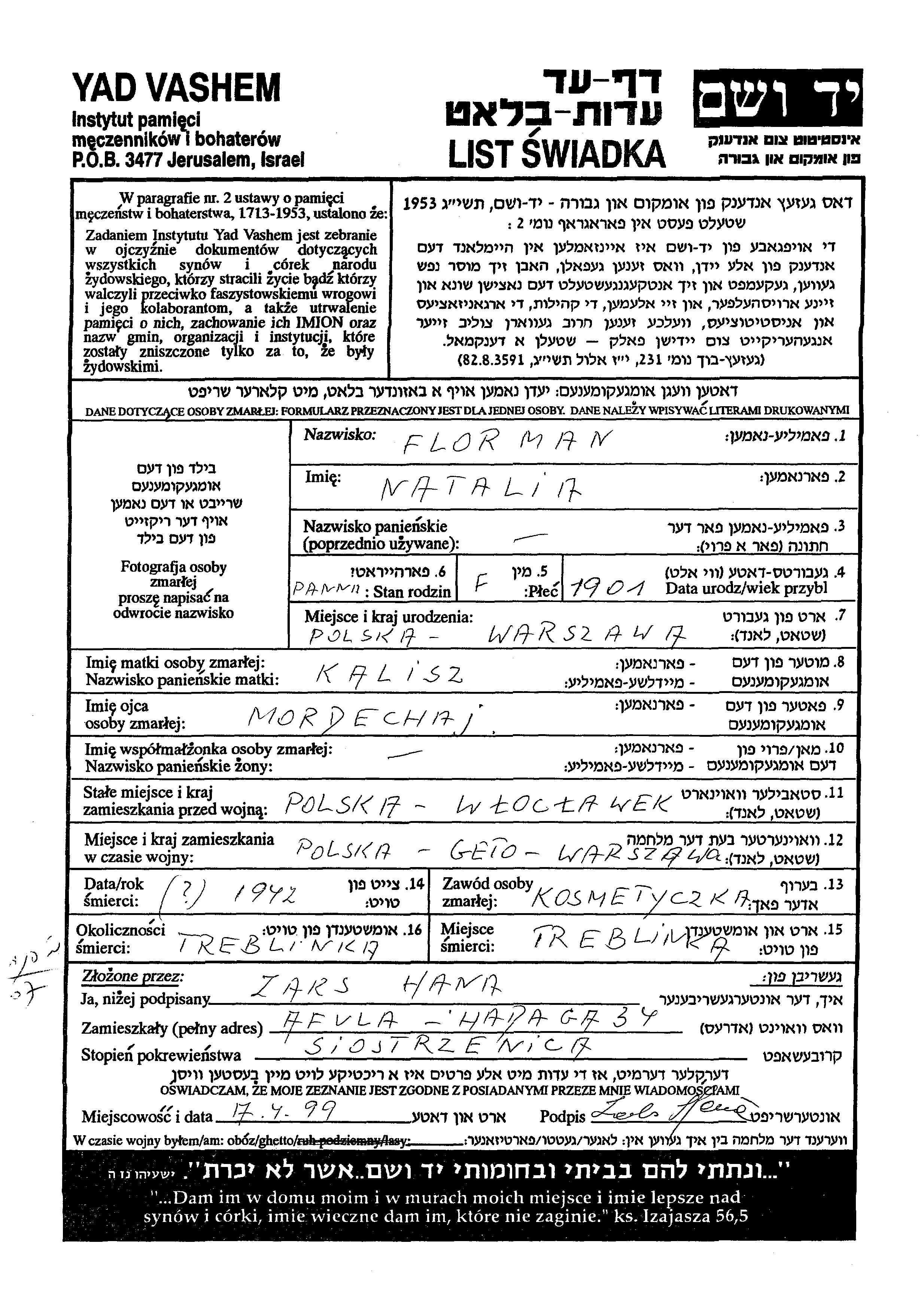Florman Natalia 1901 Wloclawek, Pologne Feuille de témoignage