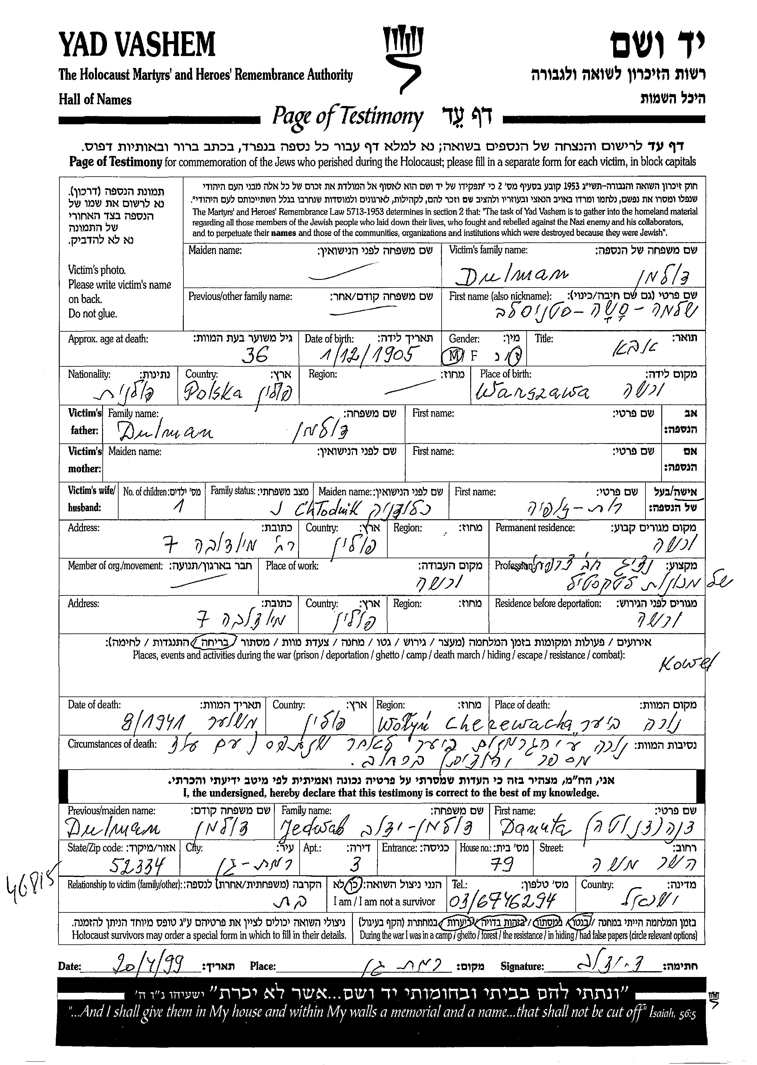 Dulman Stanislav Sasha Shlomo 1905 Warszawa, Pologne Feuille de témoignage