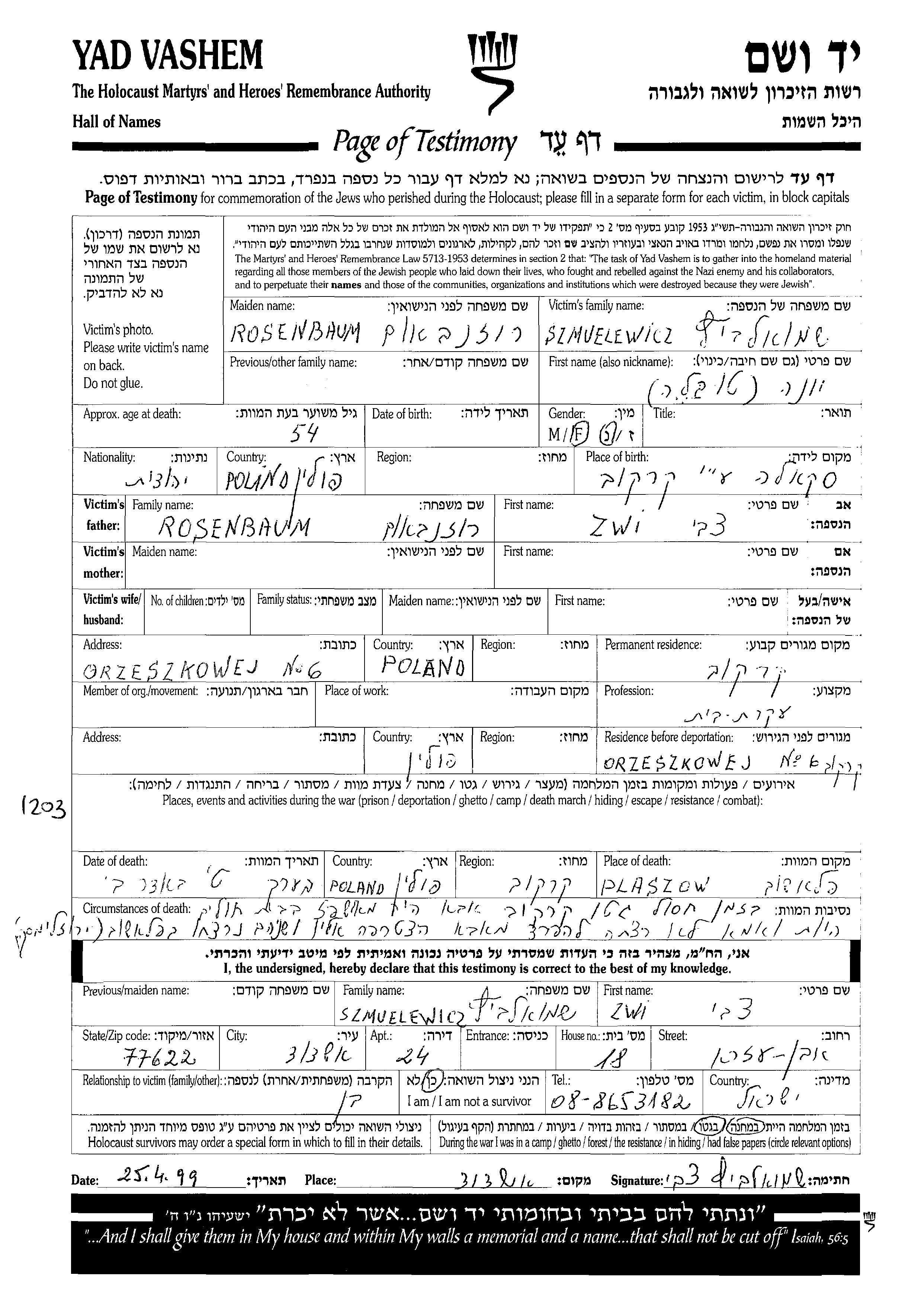 Szmuelewicz Yona Tova Krakow, Pologne Feuille de témoignage