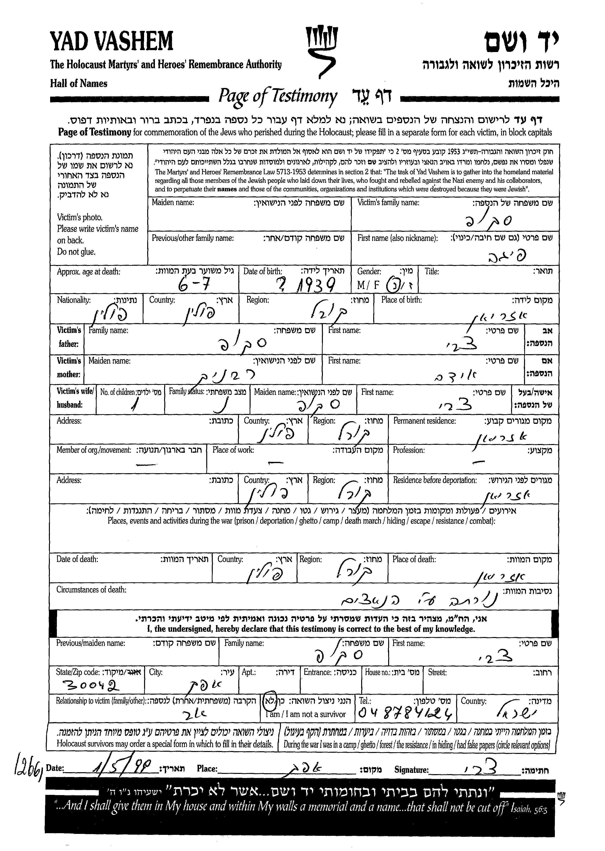 Yad Vashem - Pages of Testimony Names Memorial Collection