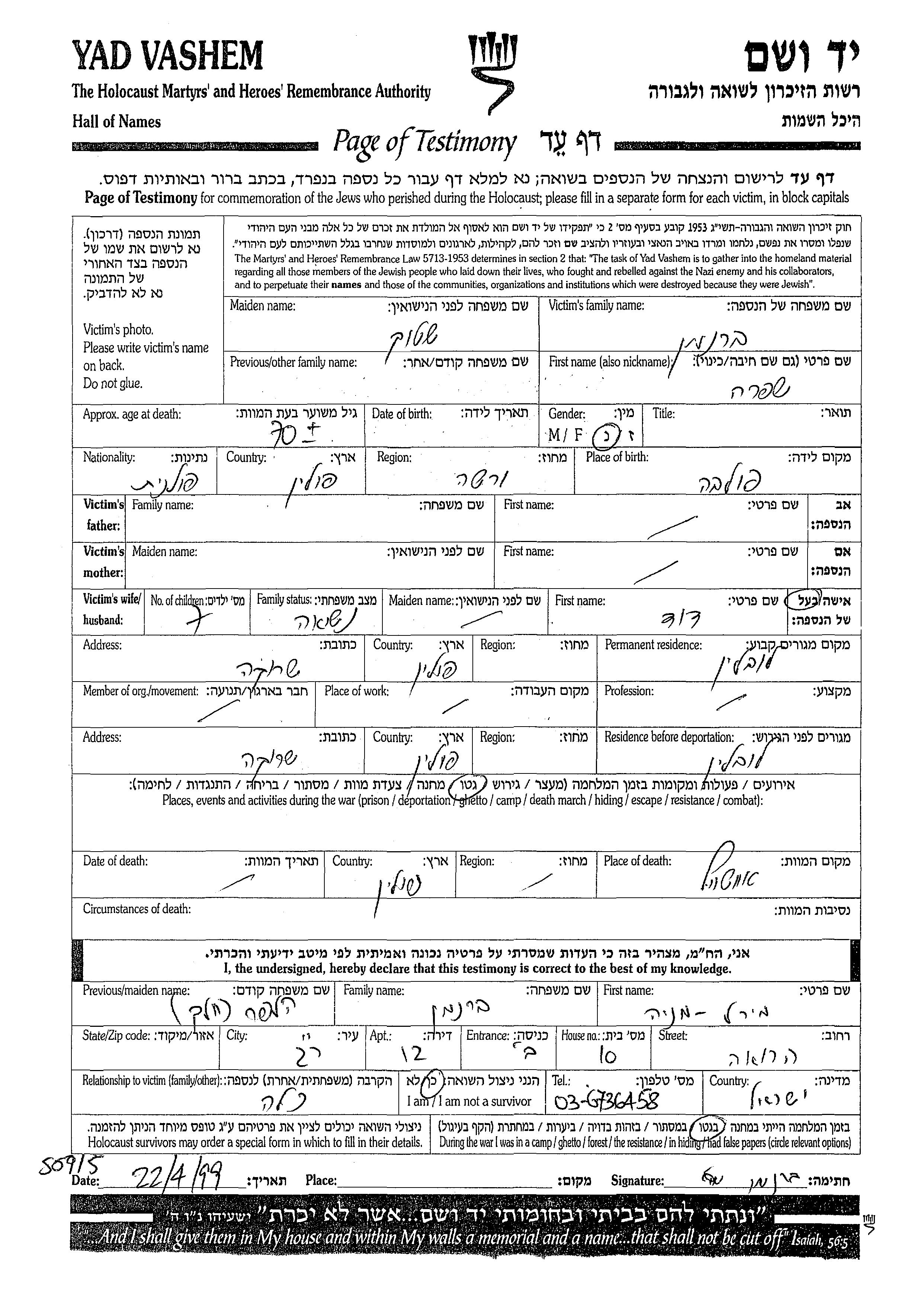Yad Vashem - Pages of Testimony Names Memorial Collection