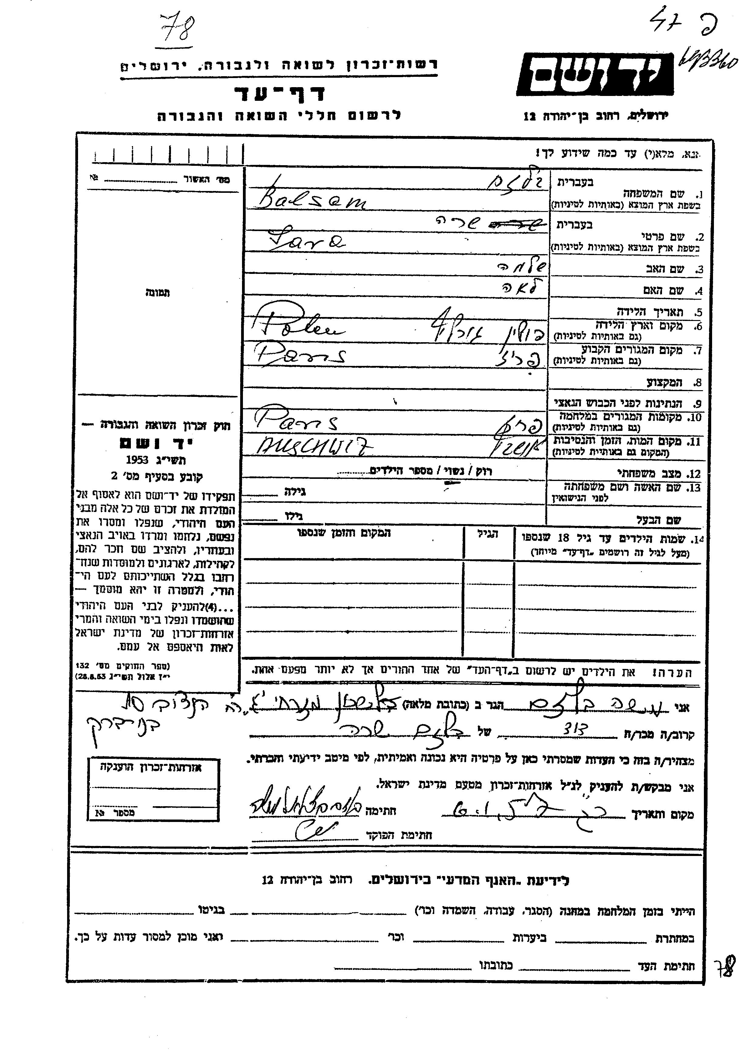 Yad Vashem - Pages of Testimony Names Memorial Collection
